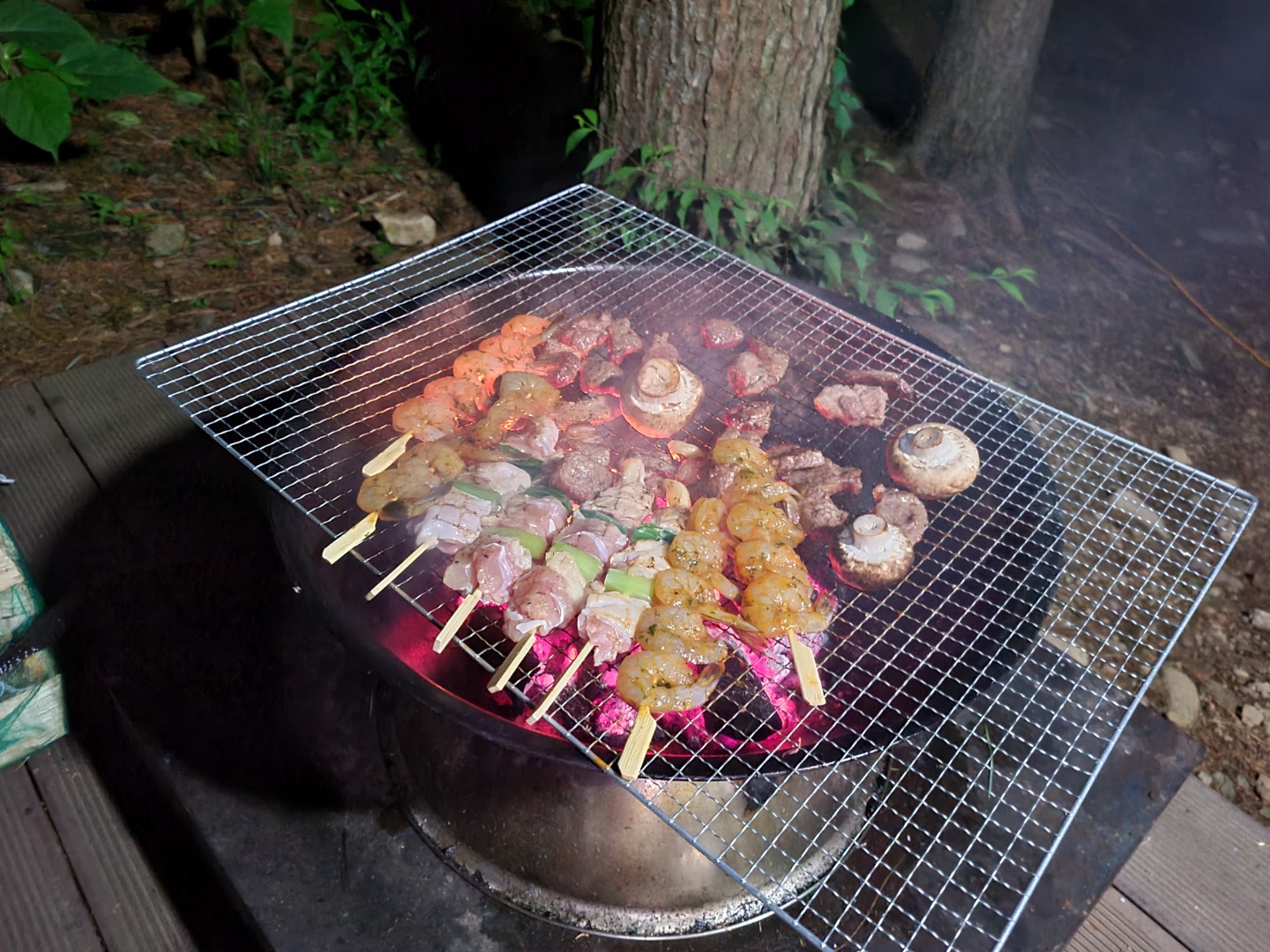 장작불에 구운 목살, 항정살, 새우꼬치는
