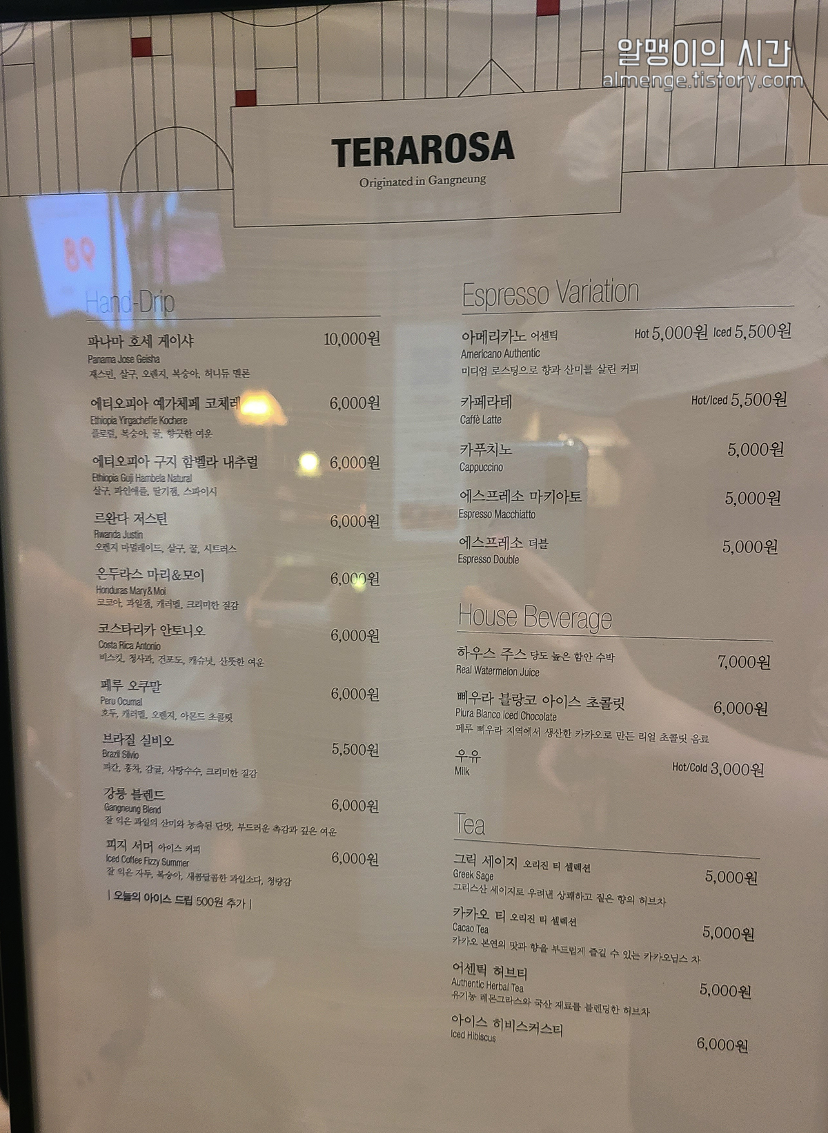 핸드드립은 따뜻하게 마셔야겠지만 여름에 아이스 못잃는 저는 아이스 가능한 메뉴로 골랐어요. 오늘의 아이스 메뉴는 그날그날 달라지는 것 같네요.