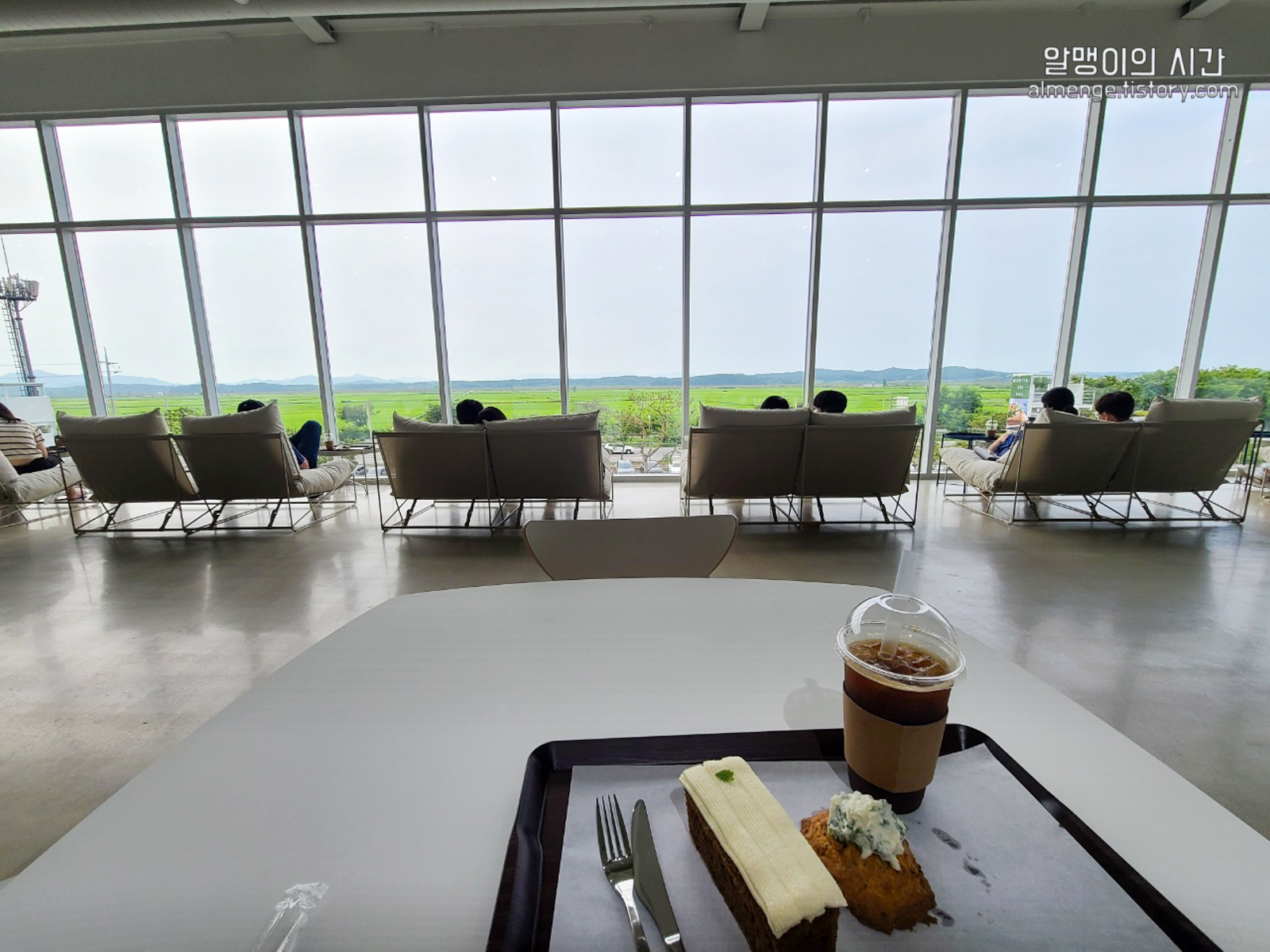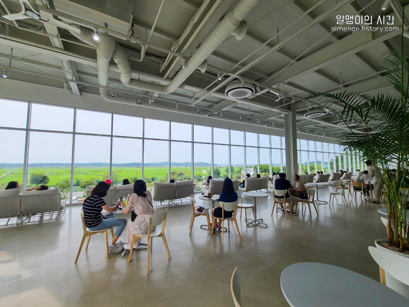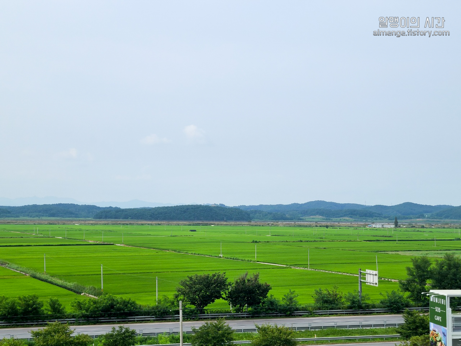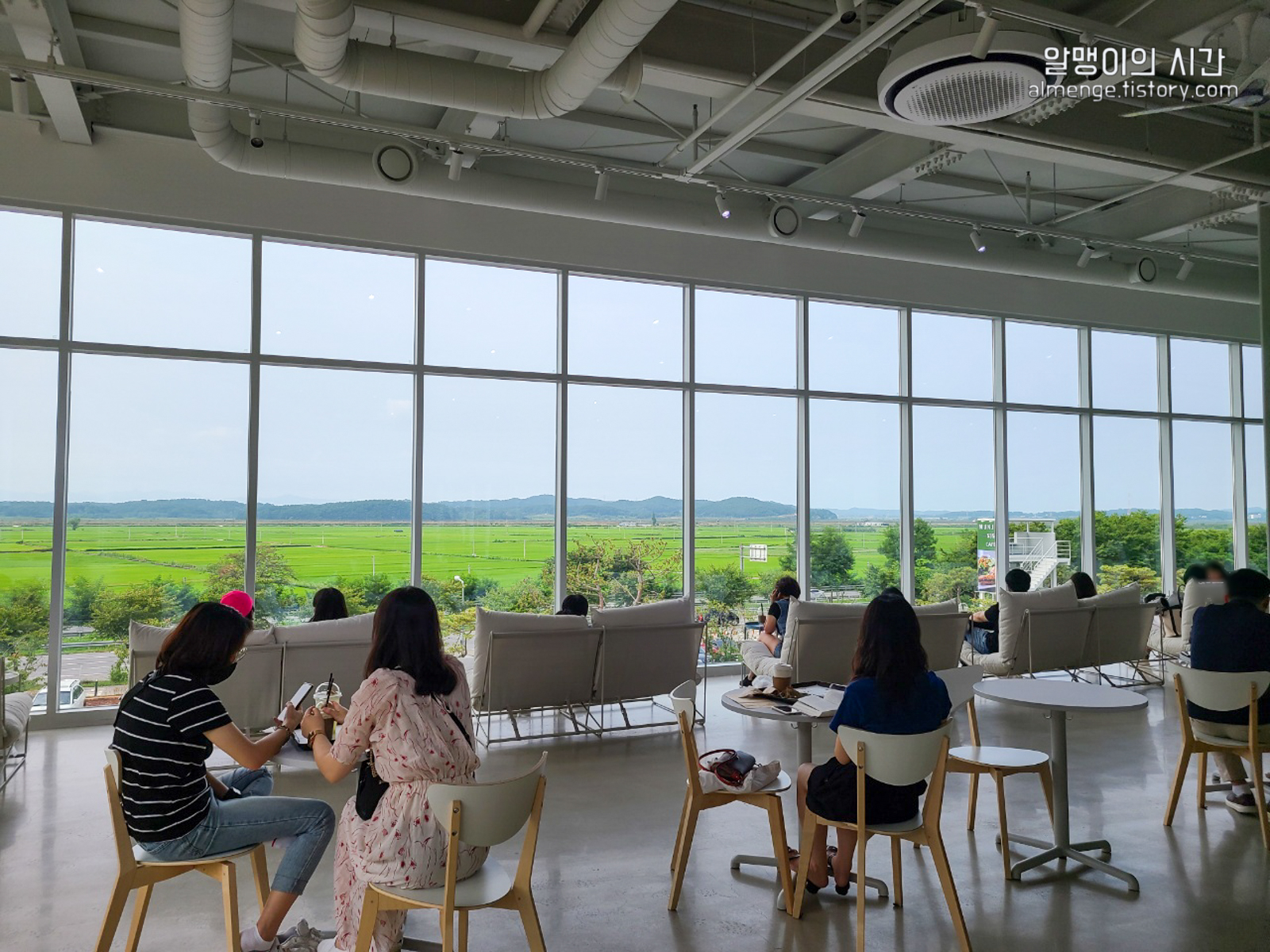 창가자리 분들이 잠시 자리 비웠을 때 찍어봤는데 막상 가까이가니 논밭만 꽉차는 뷰는 아니고, 주차장+자유로+논뷰
