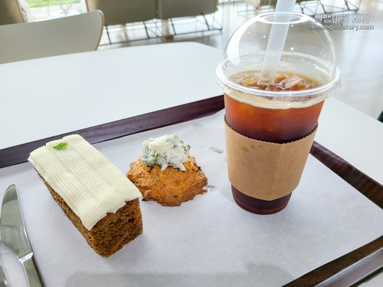 아메리카노와 당근 파운드는 다른 곳에서도 맛볼 수 있는 평범한 맛이었고, 쪽파 스콘은 시그니처 메뉴답게 독특했어요.