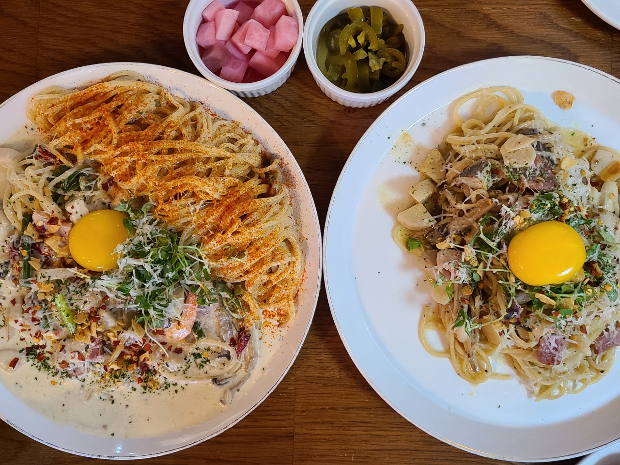 왼쪽에 고춧가루 뿌려진게 매콤 크림 파스타, 오른쪽이 오리지널 까르보나라(오일)이에요.