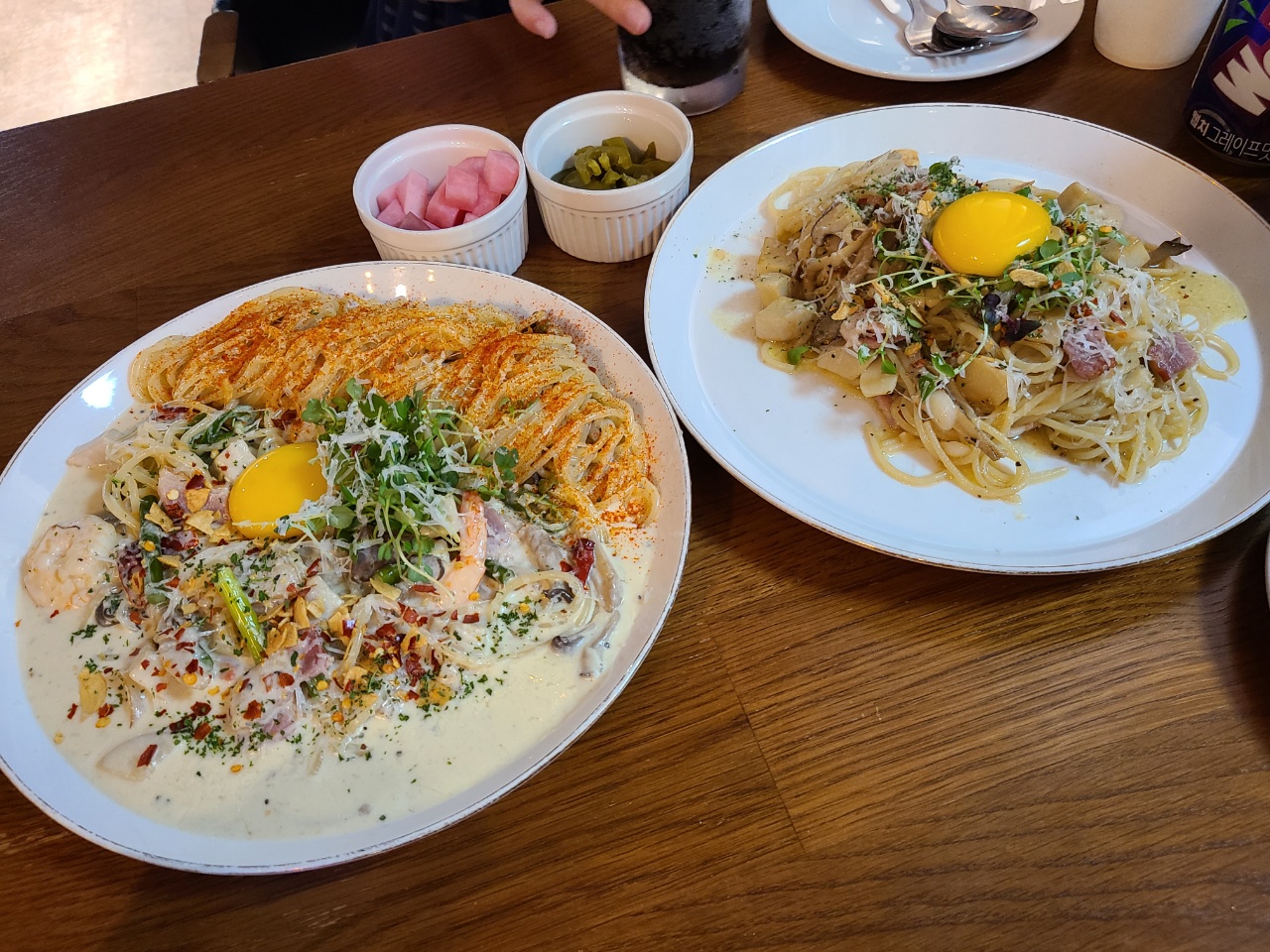 처음 가는 식당은 시그니처 시키는게 가장 안전한 것 같아 매콤 크림 파스타를 시키고, 문득 이탈리아 여행했을 때가 떠올라 또 다른 시그니처 메뉴라는 오리지널 까르보나라 (오일)를 주문했어요.