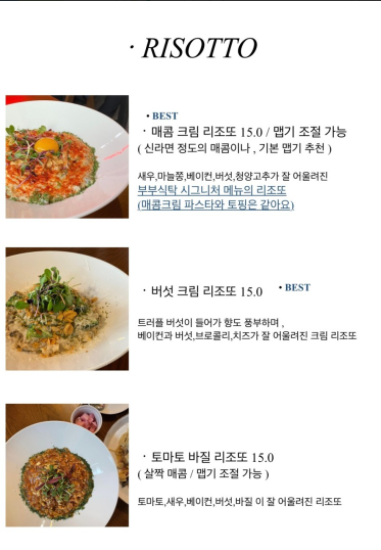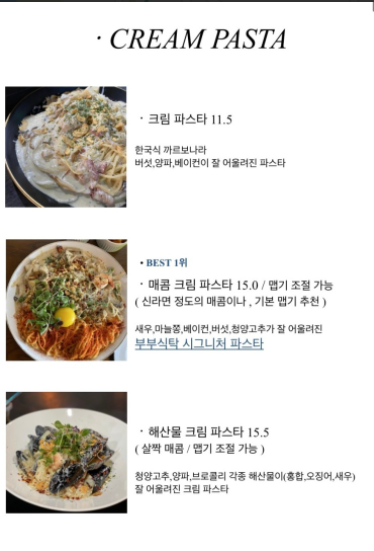메뉴판 사진을 못찍은 관게로 식당에서 올린 메뉴판 이미지로 대체합니다 ㅎㅎ 보시다시피 이 곳의 시그니처 메뉴는 매콤 크림 파스타에요.