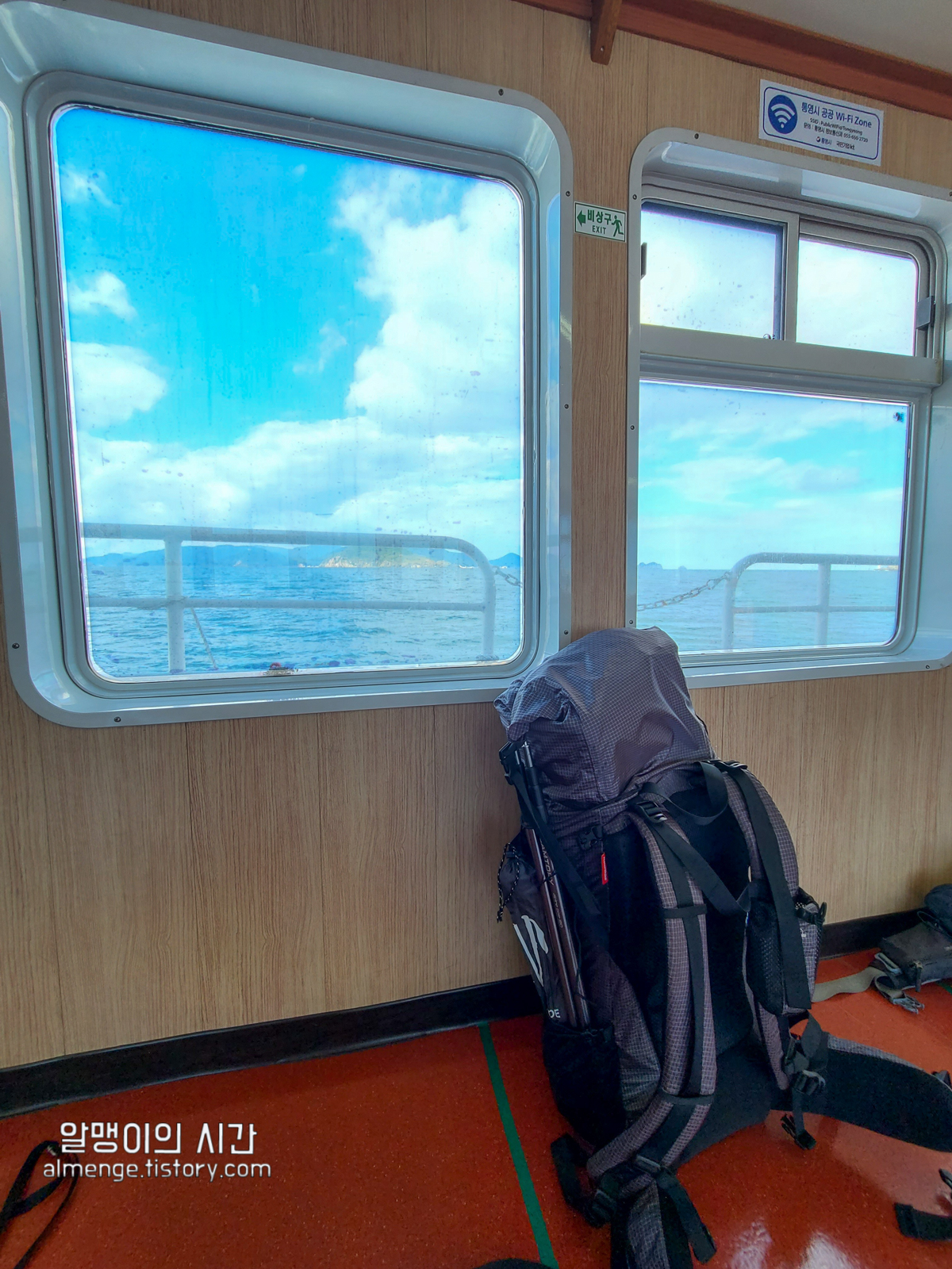 큼지막하게 목적지가 적혀 있다. 통영에서 출발하면 중간에 비진도라는 섬을 거쳐 매물도에 도착하게 된다. (대매물도) 예전 장봉도 백패킹 때 탔던 배에 비하면 이 배는 아주 작은 편. 배멀미 하는 사람이면 힘들 수도 있겠다 싶은 크기였다.