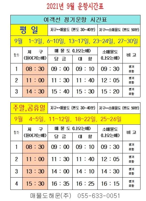 거제 저구항에서 가시는 분들은 아래 시간표를 참고하시면 된다. 거제 저구항에서 매물도(대매물도)까지는 30~40분 정도 소요된다.