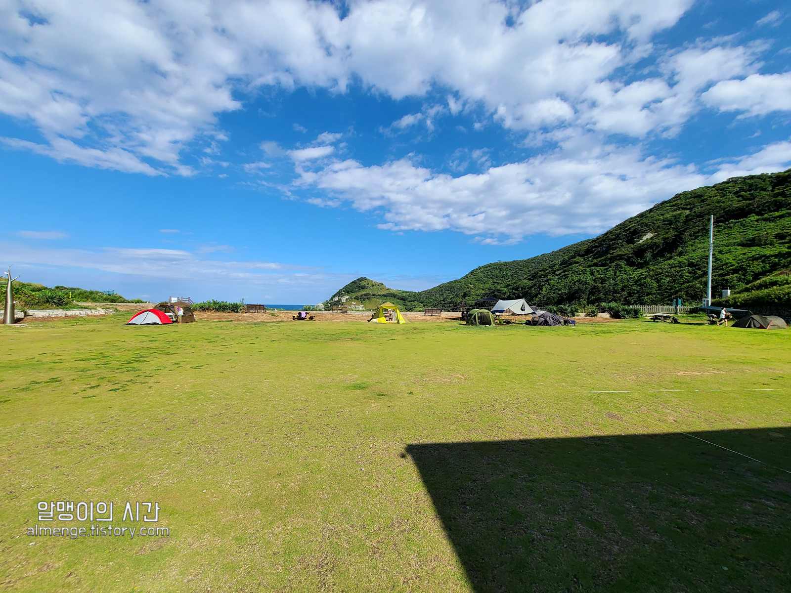 잔디밭 전방에 시원하게 펼쳐진 바다부터 구경한 후 어디에 텐트를 칠 것인가 잠시 고민했다. 바다와 가까운 전방 1열 자리는 그늘 하나 없는 땡볕. 이 날의 햇볕은 우리를 잡아먹을 것 처럼 맹렬했기에 일단은 폐교 건물 바로 앞 그늘 자리에서 잠시 휴식을 취한 후 텐트를 피칭하기로 했다.