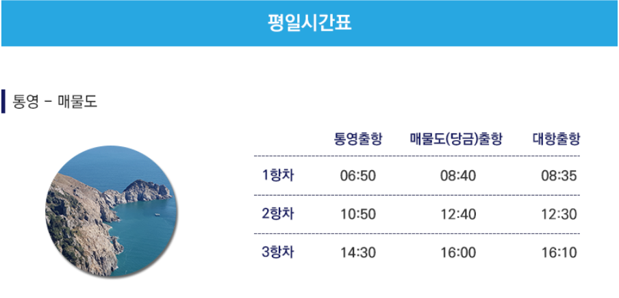 통영 여객터미널에서 출발하는 시각은 위 이미지에서 '통영 출항' 아래의 시각을 보면 되고, 캠핑장에서 통영으로 출발하는 배시간은 '매물도(당금) 출항' 아래의 시각을 보면 된다.