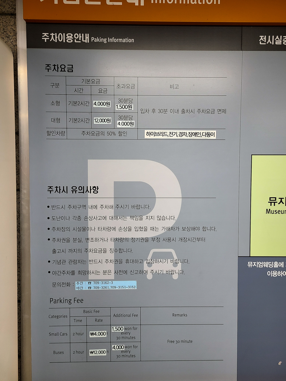 경차, 하이브리드 차량 등 저공해 차량 등의 경우 50%할인이 적용되는데 저는 경차라 주차비 2000원만 냈네요. 주차장은 무인 정산 시스템으로 운영되고 있어 전시 보고 지하 주차장으로 나오는 길에 있는 사전 정산 키오스크에서 정산하시면 됩니다. 따로 직원분을 호출하지 않아도 경차 할인이 자동으로 적용되더라구요. 만약 할인 대상자인데 할인이 자동으로 적용되지 않았다면 호출 버튼을 눌러 말씀하시면 될 듯!