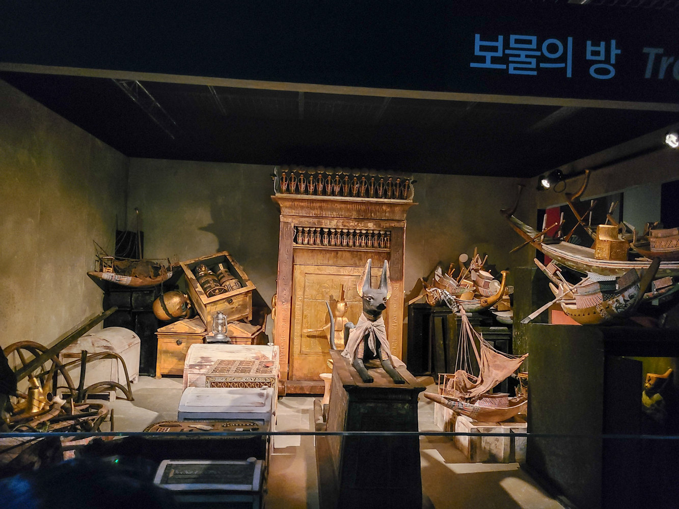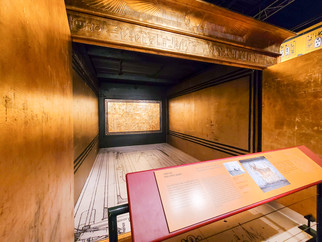 파라오의 미라와 관이 있던 현실을 재현한 공간이에요. 오디오 가이드속 하워드 카터가 무덤을 처음 열고 들어갔던 감격스러운 순간과 함께 하던 곳. 성우의 설명이 끝난 후 짠 하고 불이 밝혀지는 모습이 멋있었어요.