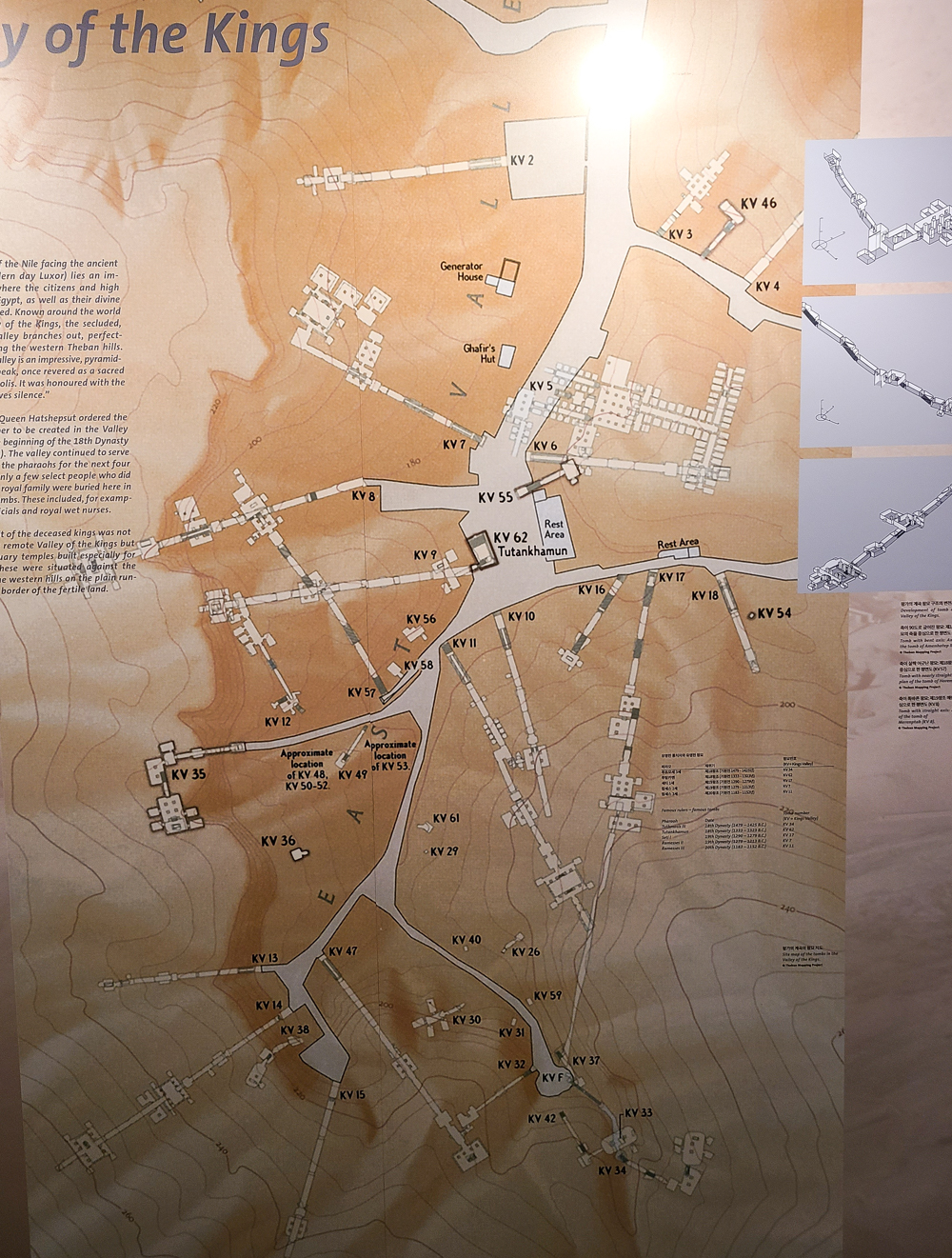 전시 초입에는 아래와 같은 왕가의 계곡(이집트 룩소르의 여러 파라오들의 무덤이 있는 곳) 지도가 있는데