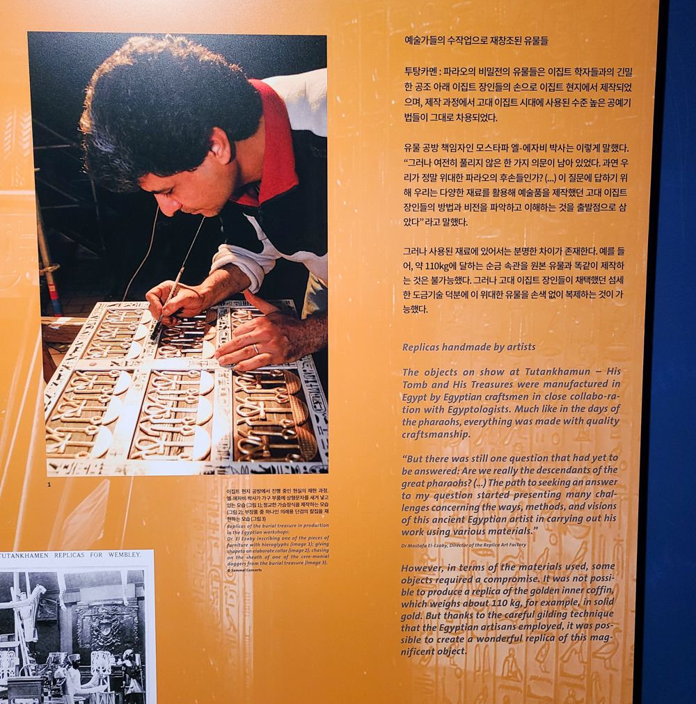 보통 전시에는 진품들이 전시되는데 이 전시에 전시되는 모든 전시품들은 진품을 똑같이 복제한 복제품이에요. 그럼 진품은 어디 있냐고요? 이집트 카이로 박물관, 그리고 룩소르 왕가의 계곡 투탕카멘의 무덤에 있어요.