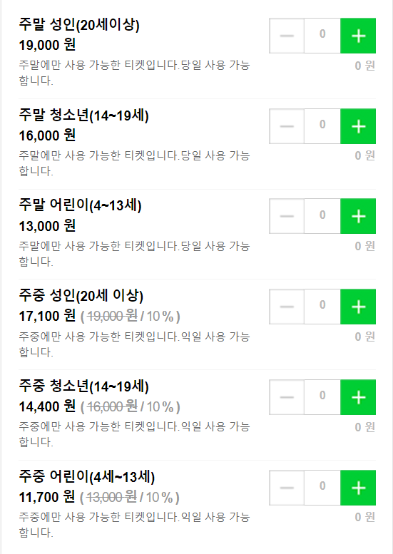 -입장료(정가) : 성인 19000원, 청소년(14~19세) 16000원, 어린이 13000원