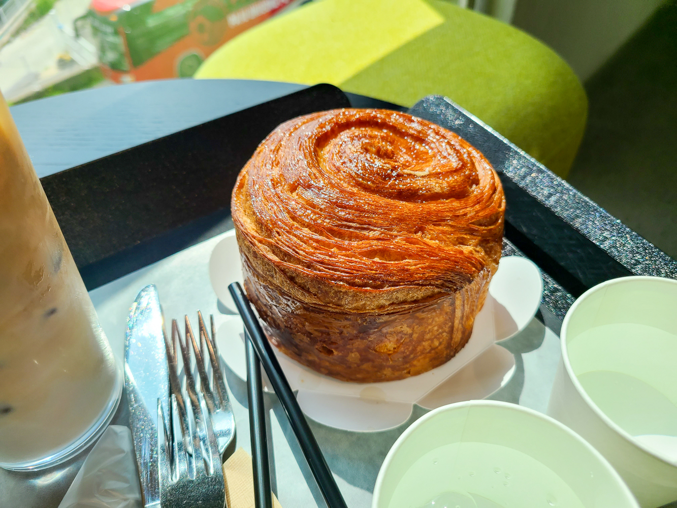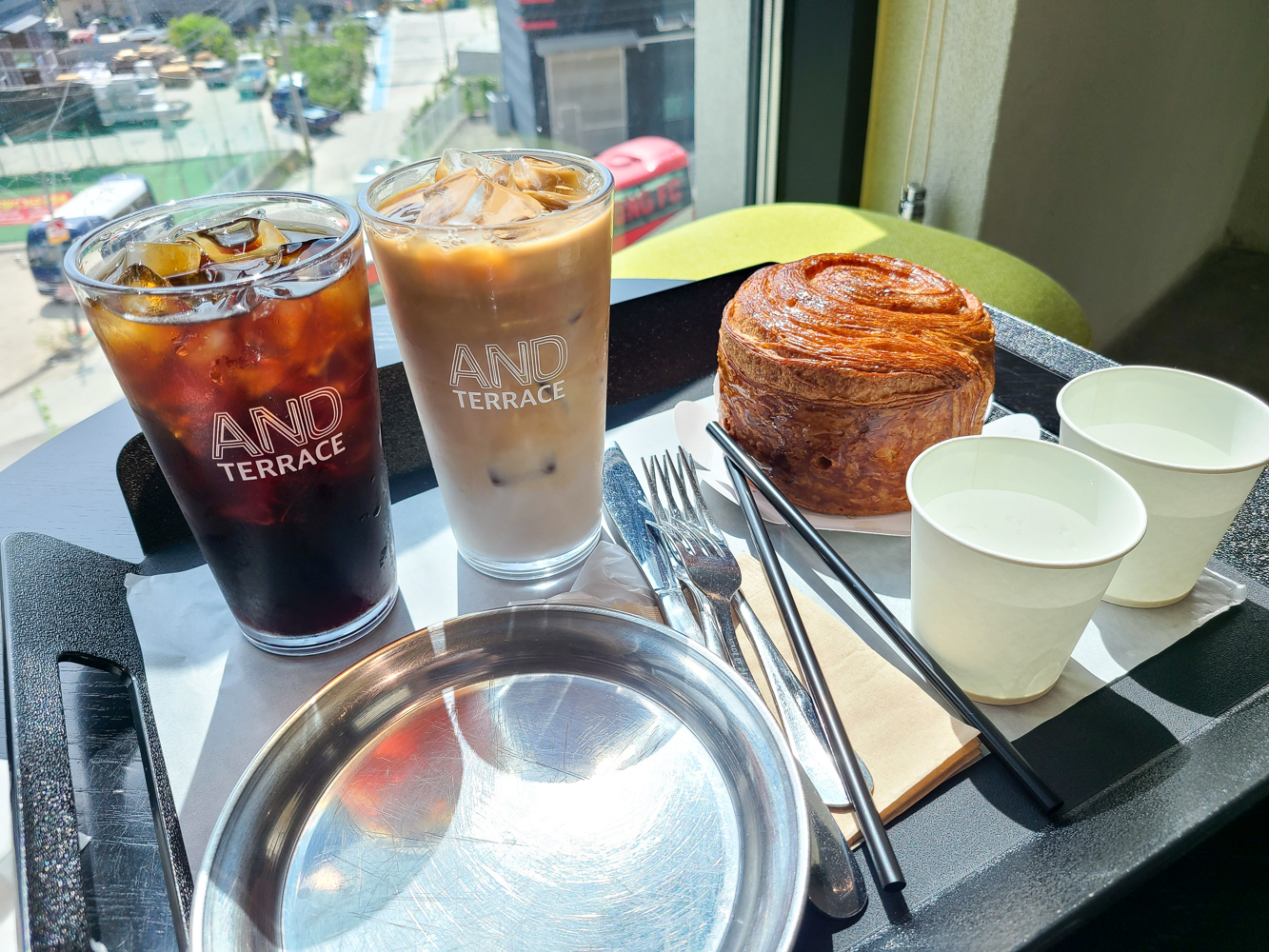 흔들의자에 푹 기대고 흔들흔들 앉아 있으니 진동벨이 울려 음료를 받아왔어요. 우리가 주문한 건 콜드브루, 콜드브루 라떼 그리고 한라봉향 나는 빵. 베이커리 코너 옆에 셀프바가 마련되어 있어 필요할 경우 거기서 빵을 커팅하거나 앞접시, 빨대, 포크, 나이프, 물을 챙겨오시면 됩니다.