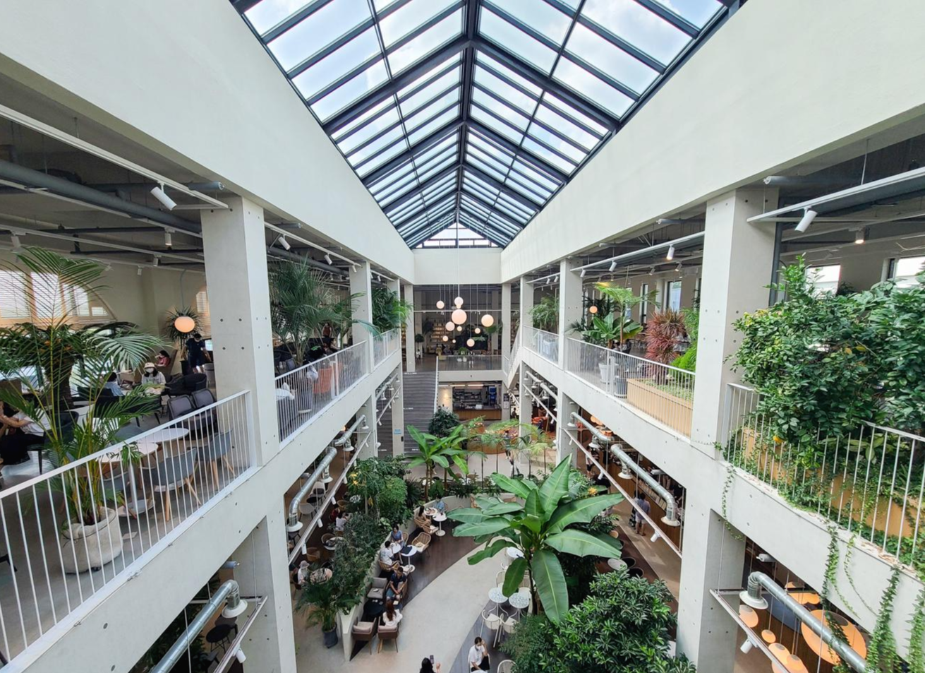 대형 카페 답게 탁 트인 높은 천장과 카페 곳곳의 식물들이 싱그러운 느낌을 줘요.