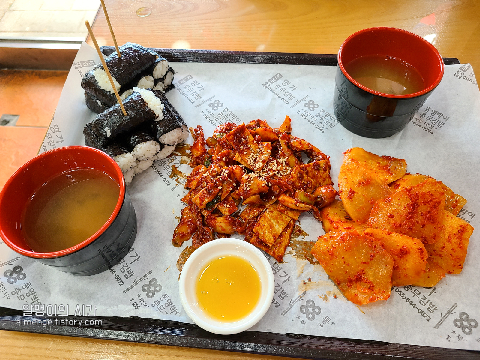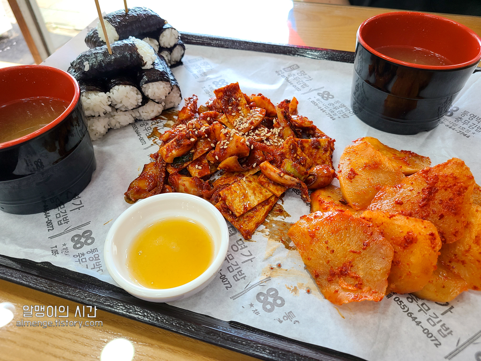 김밥 8개가 1인분이고 국물과 함께 오징어무침, 석박지가 쟁반에 같이 담겨 나와요.