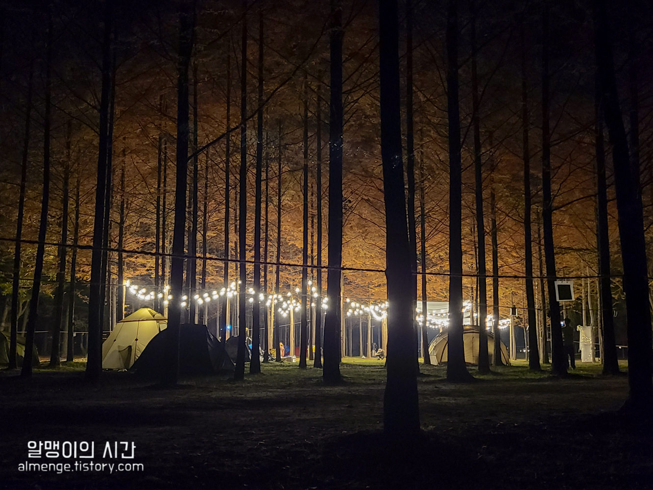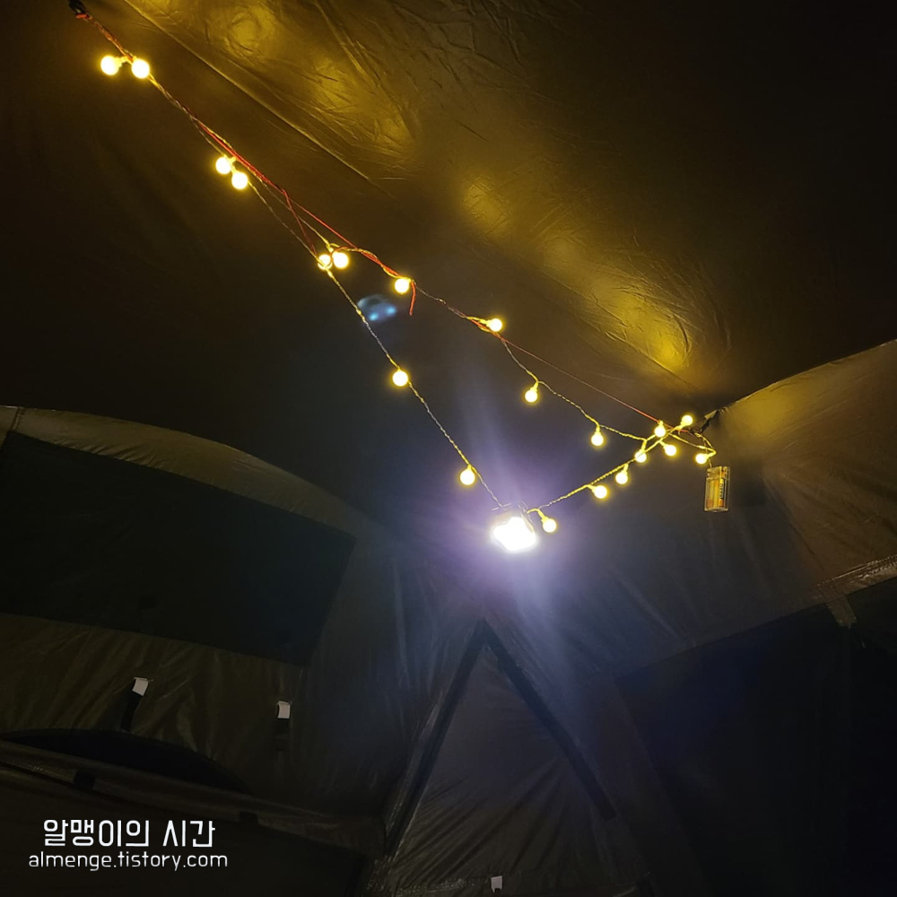부른 배 두들기며 섬이나 한 바퀴 둘러보기로 하는데 어느덧 옆 캠핑존2에 켜진 조명이 예쁘게 빛나고 있다. 실제로 보면 훨씬 밝아서 저 아래 텐트를 친다면 눈뽕 장난 아닐듯. 그래도 보기엔 예쁨.