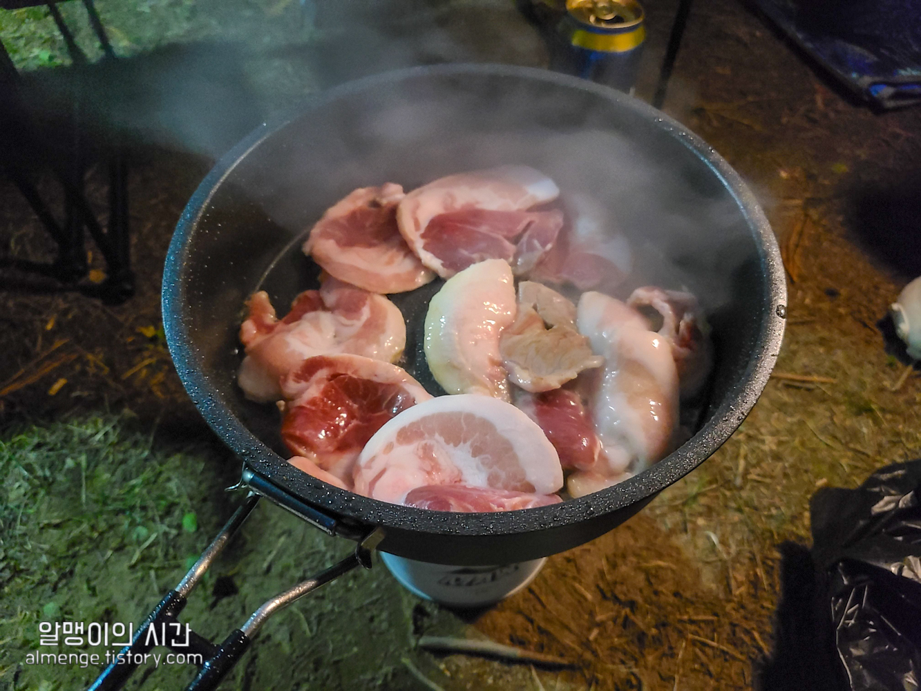 아몰랑 캠핑엔 고기지 하며 고민도 없이 싸간 내 뽈항정살 ㅎ 뽈항정살 기름에 새송이 버섯 구워 먹으면 얼마나 맛있게여? 자기가 가져온 건 자기가 요리한다는 암묵적인 룰으로 인해 고기 굽는 나. 굽는 족족 사라져가던 고기 ㅎㅎ 메뉴 선정 성공쓰