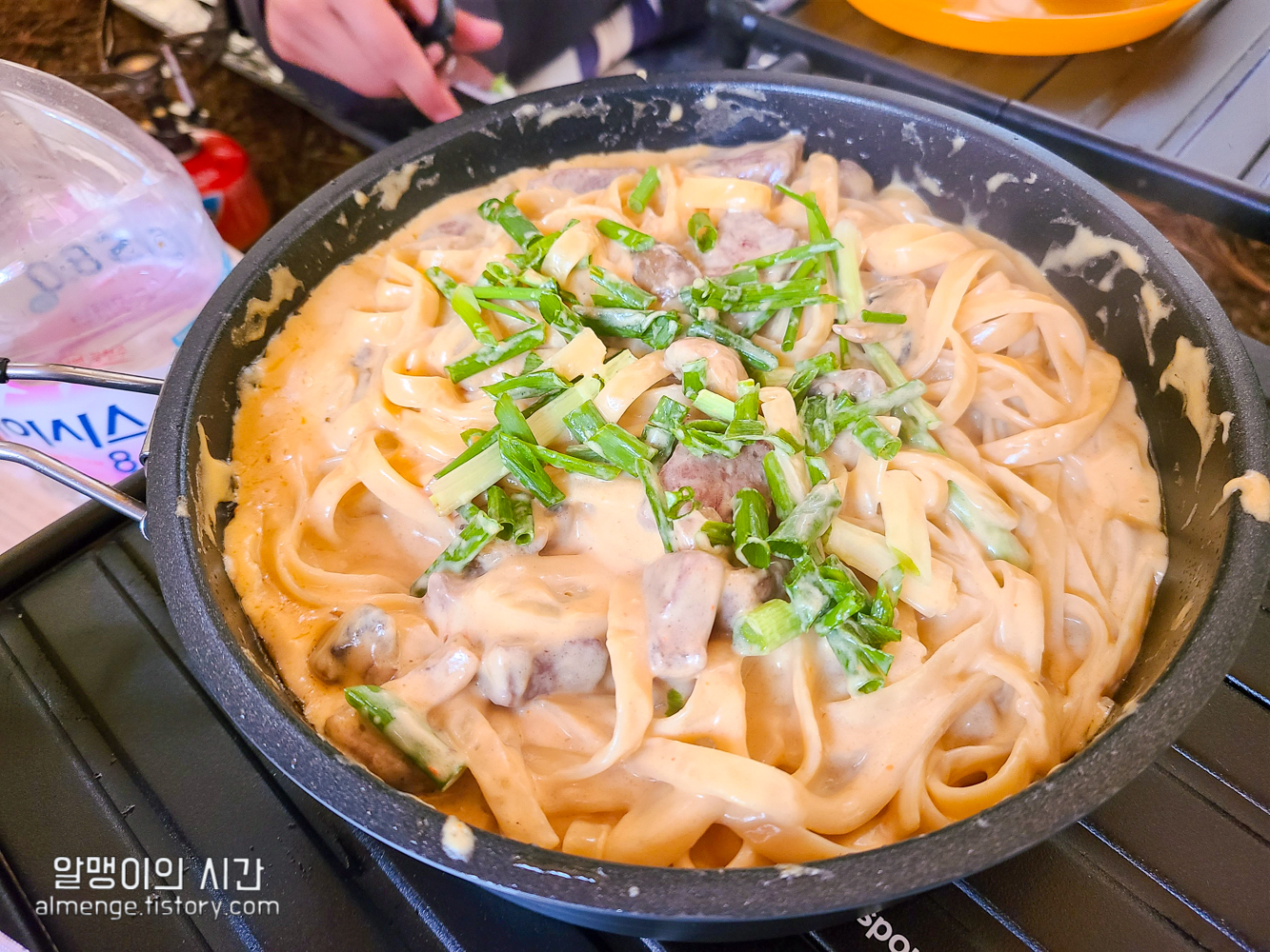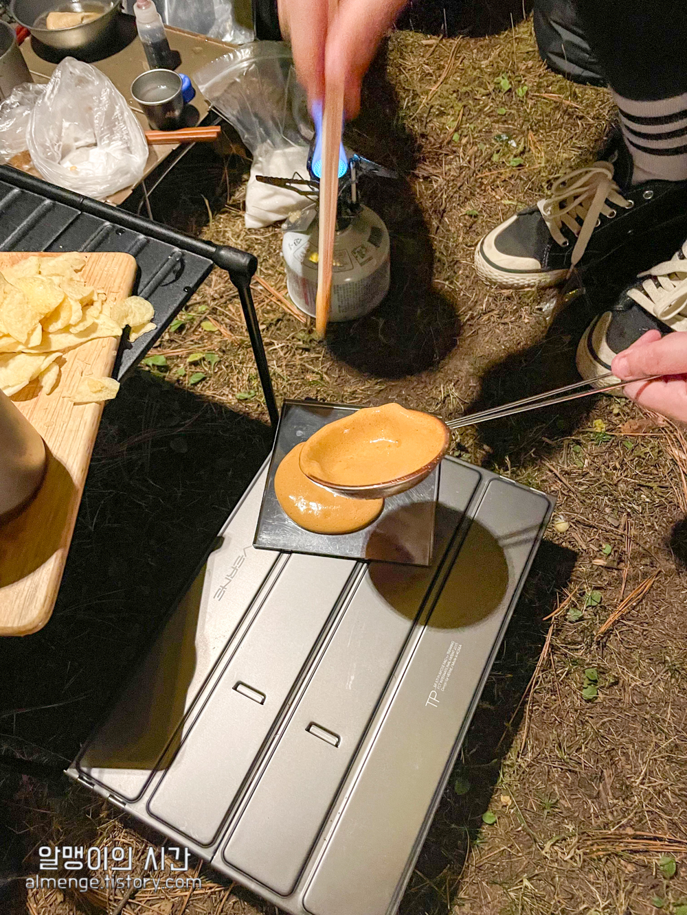 원없이 산책을 마치고 3차전을 벌이는데, 양은 주전자 오뎅, 회, 항정살은 저리 가라 정도의 메뉴들이 계속 튀어나옴. 아 이 사람들 정말 캠핑 음식에 진심이다.