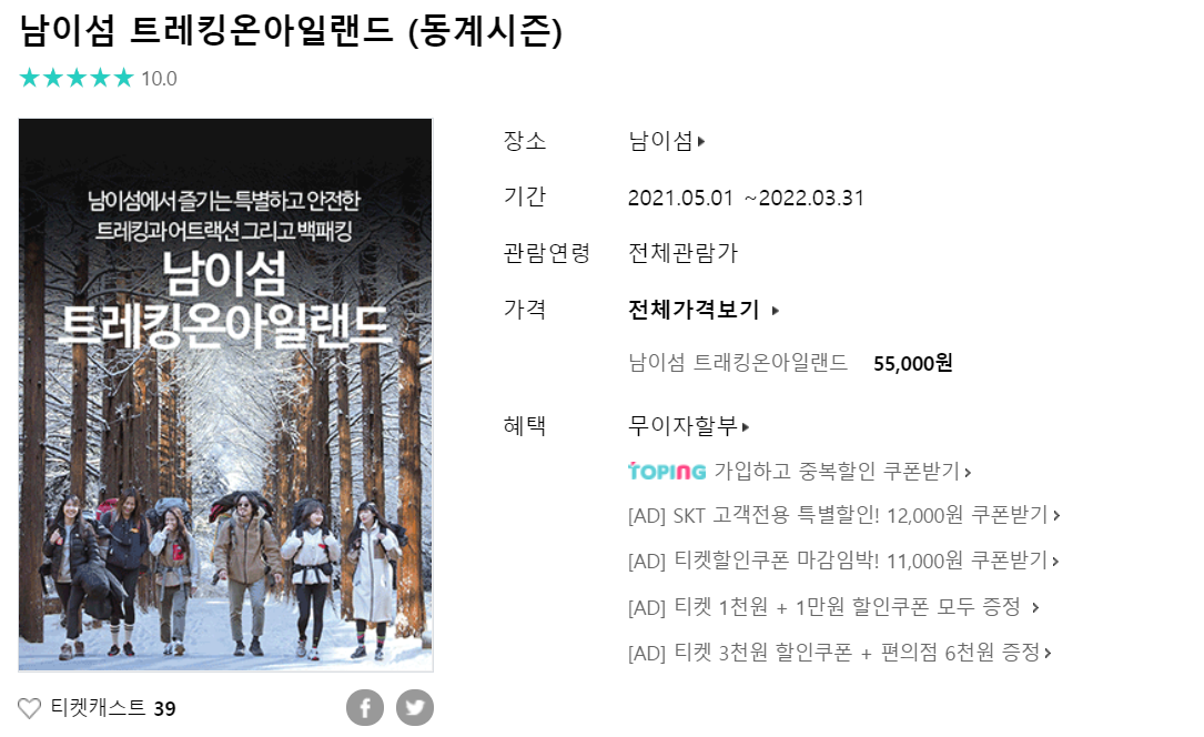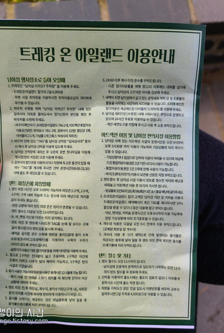 캠핑장 예약은 인터파크 티켓에서 할 수 있다. 현재는 동계 시즌 티켓 판매중임. 남이섬 트레킹 온 아일랜드 기본 정보는 아래와 같다. (출처 : 인터파크 티켓)