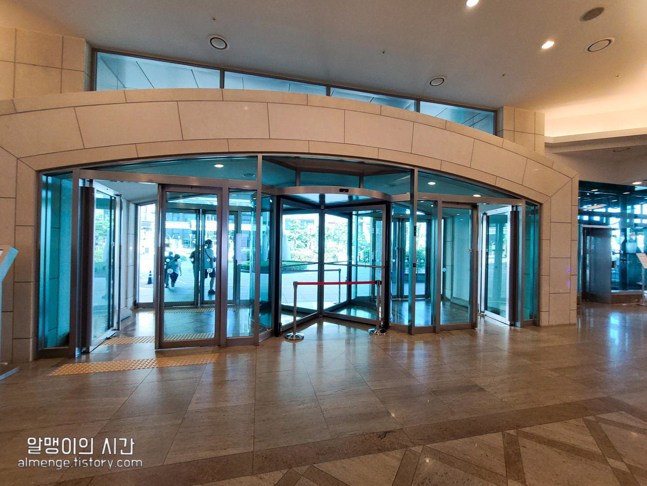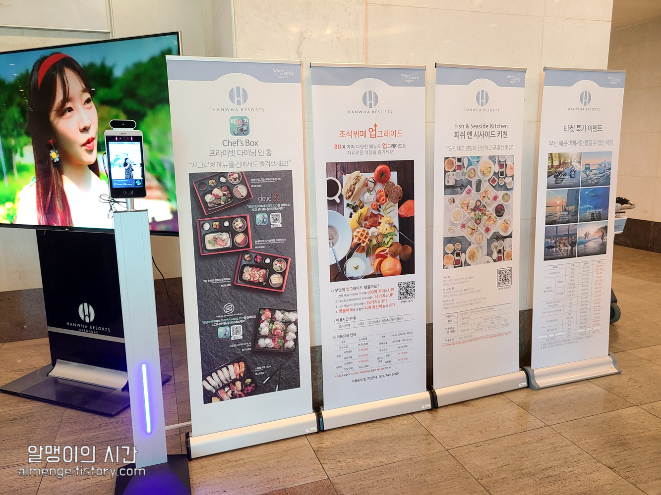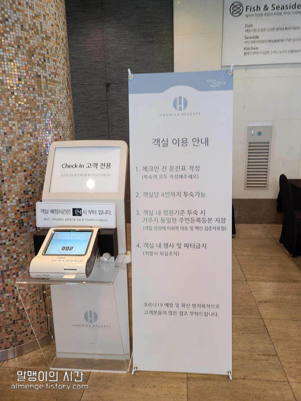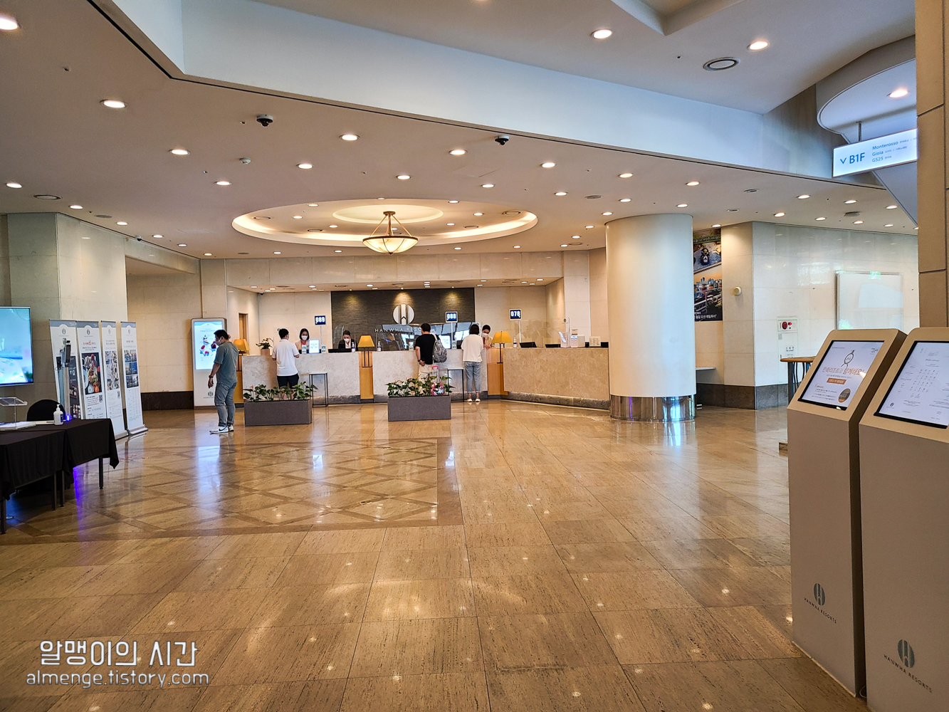 로비 모습은 지은 지 꽤 되는 전형적인 로비 모습인데 코시국이라 체온체크 하는 곳, 문진표 작성하는 곳이 마련되어 있었습니다. 한화리조트를 예약하면 숙박일 며칠 전에 모바일 문진표를 보내주는데 모바일 문진표를 미리 체크해서 보내면 방문해서는 별도의 문진표를 작성하지 않아도 됩니다:)