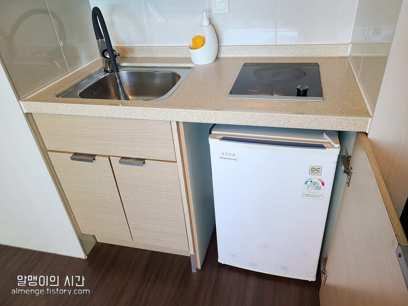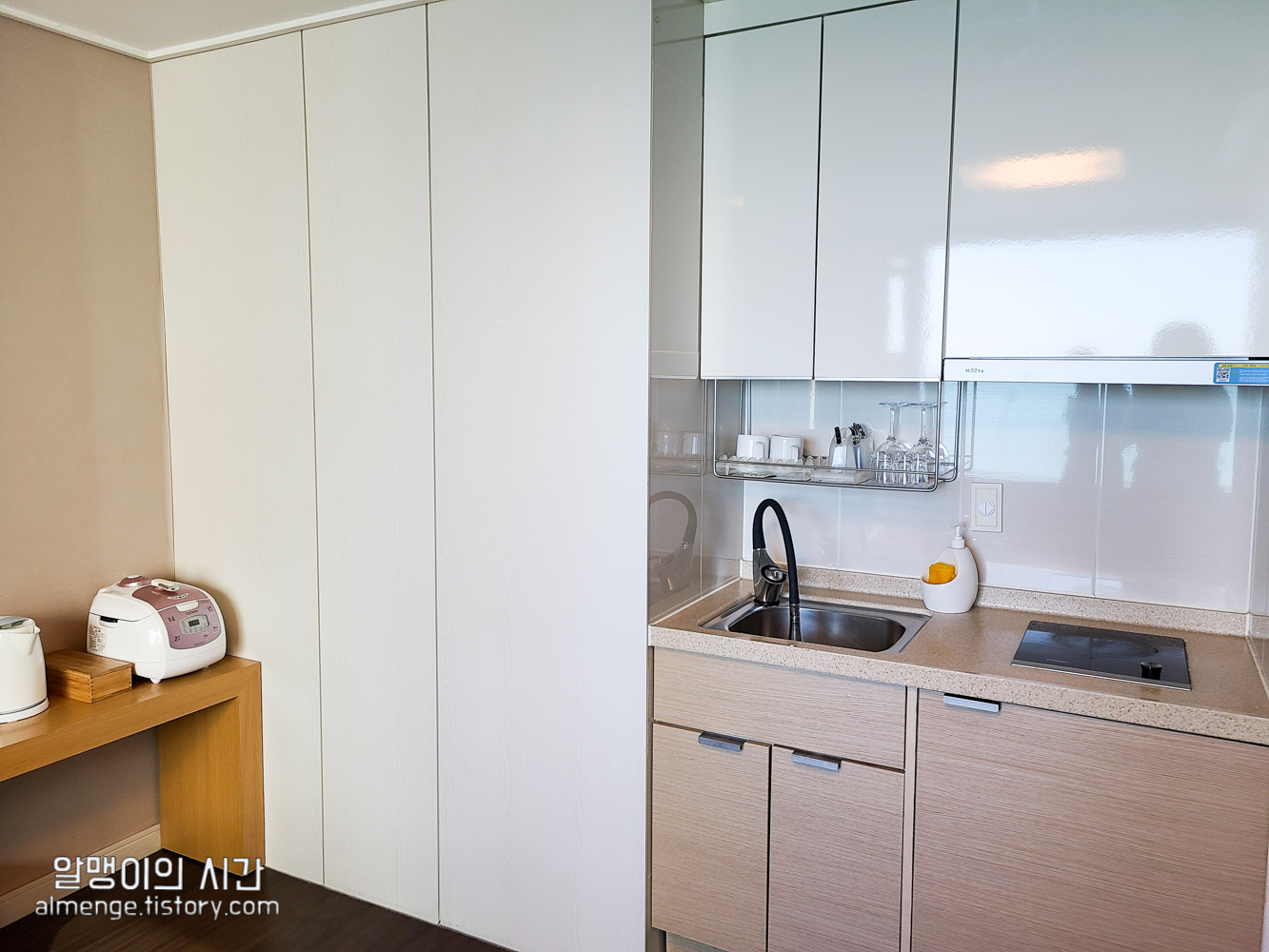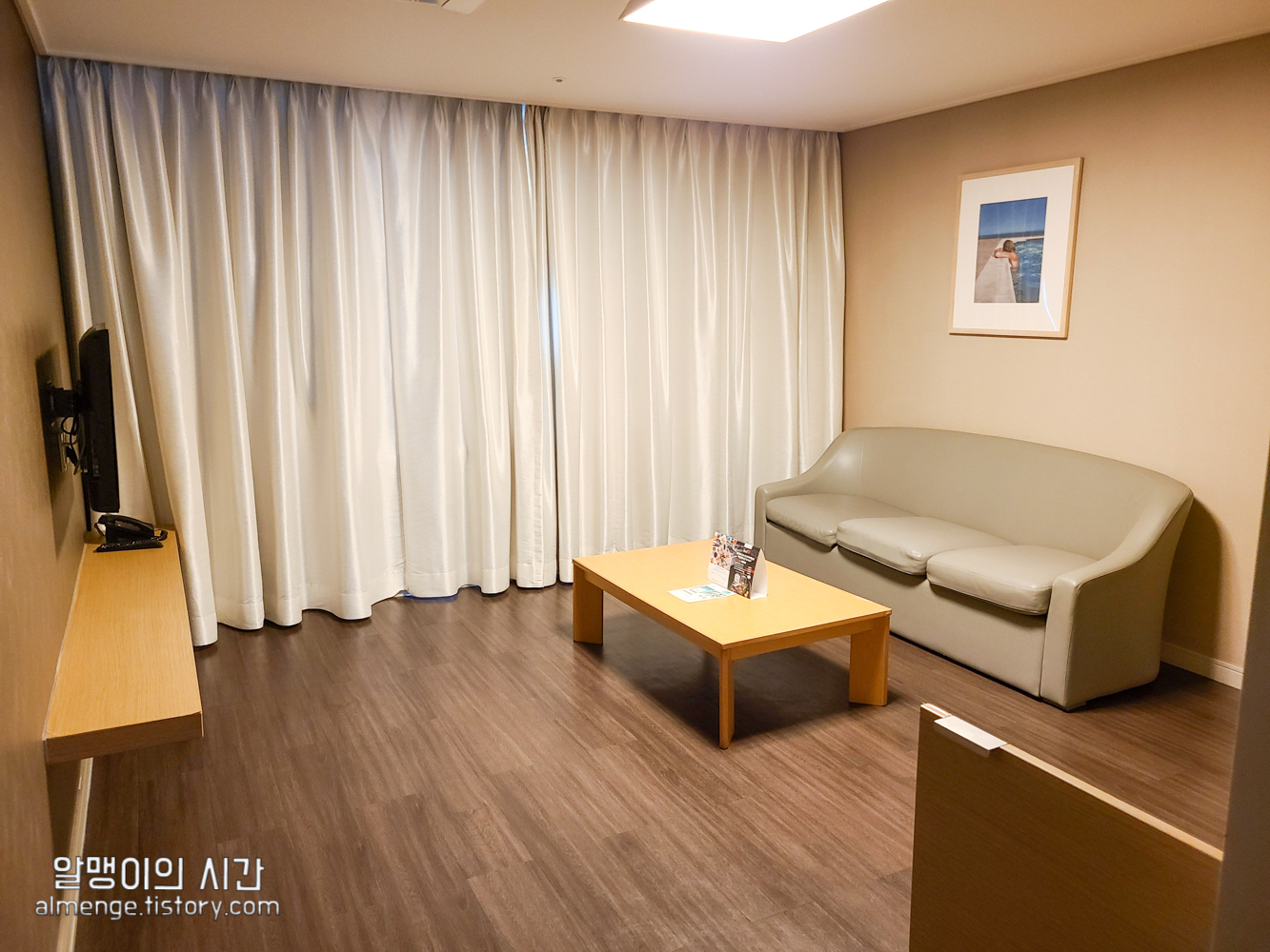여느 리조트 처럼 취사도구, 부엌이 갖추어져 있고, 거실1, 작은 방1, 화장실1로 구성된 구조입니다. 지은지 꽤 되는 리조트라 그런지 낡은 느낌은 있지만 깔끔하게 관리되고 있다는 느낌이었음