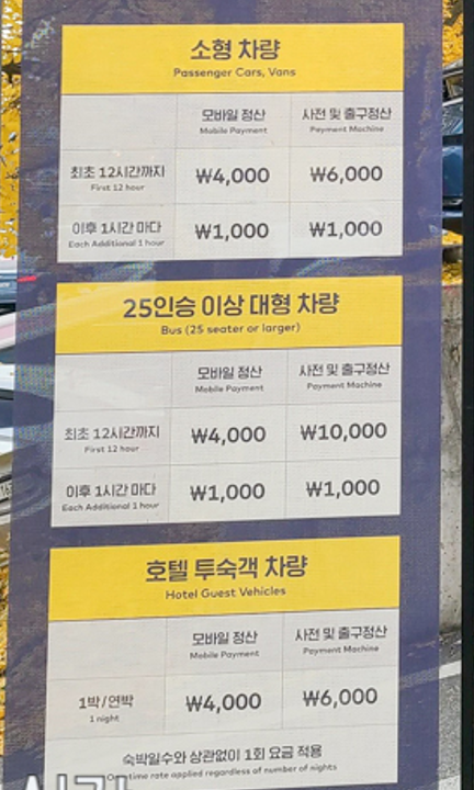 보시다시피 카카오 주차장으로 바뀐 이후엔 카카오T앱으로 모바일 정산하면 주차비가 할인되므로 모바일 정산 추천해요. 남이섬에서 숙박까지 하는 경우는 많지 않으니 12시간이면 충분하고도 남는 시간일 것 같네요.