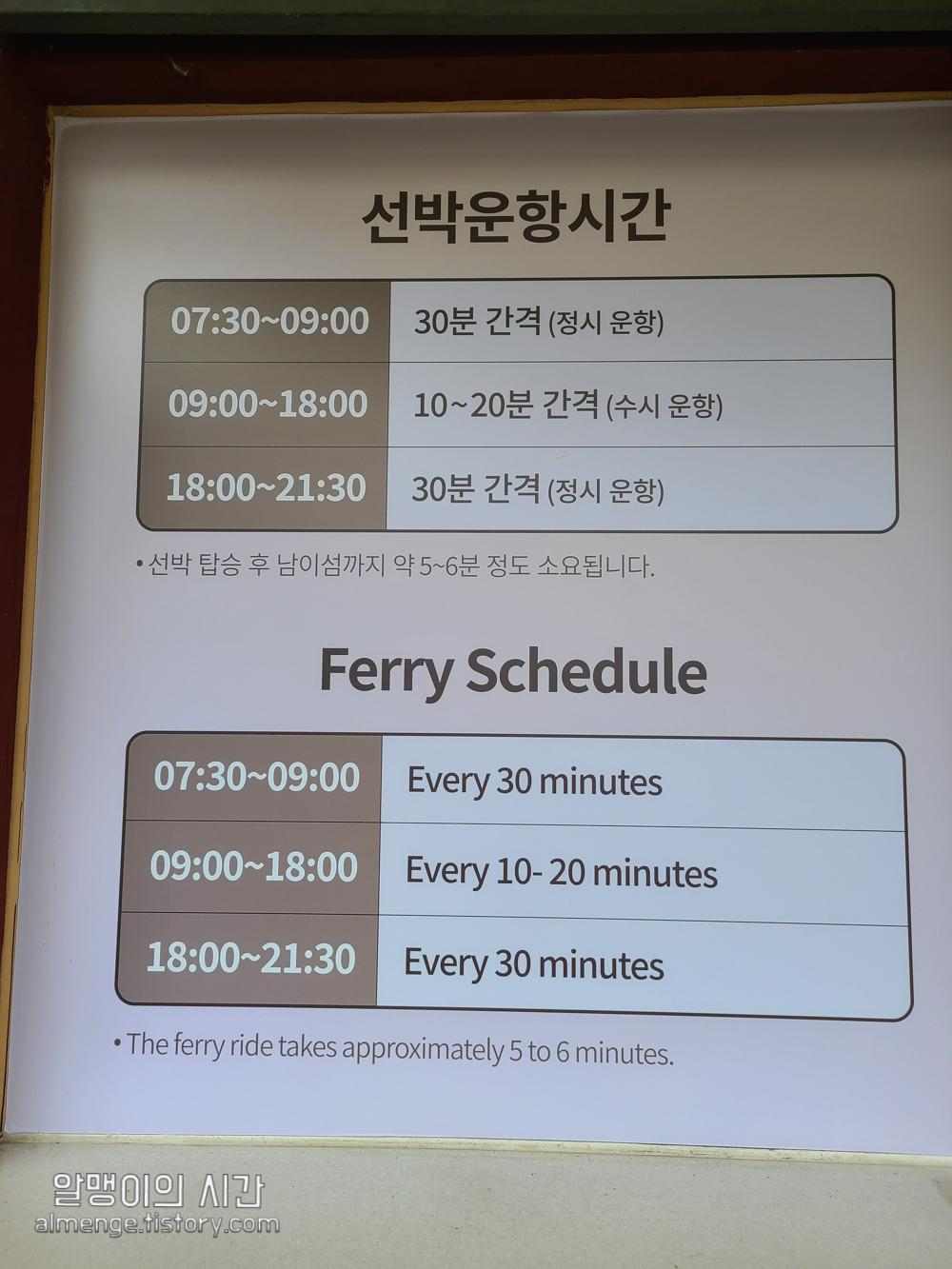 남이섬은 나름 북한강에 있는 큰 섬이기 때문에 배를 타고 들어가는데요. 배 타는 시간은 5분 남짓이라 금방이에요. 배 시간표는 아래와 같습니다.