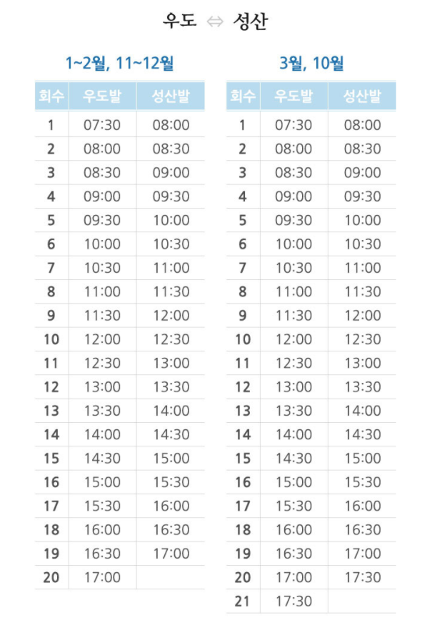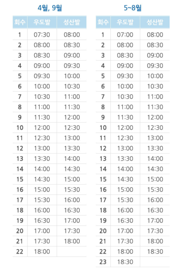 성산항-우도 배시간표는 아래와 같다. 성산항에서 우도(성산발), 우도에서 성산항(우도발) 시간표가 모두 나와 있다.