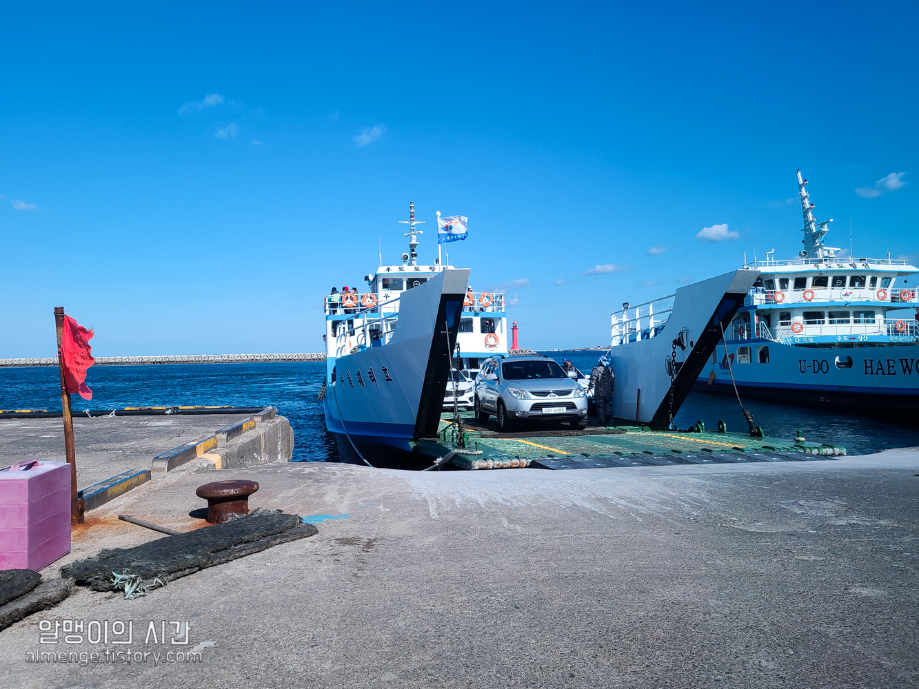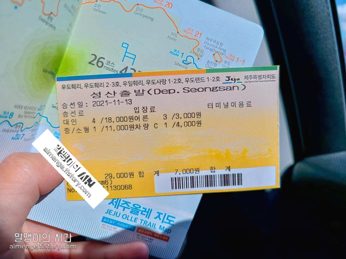 성산항에서는 오전 8시를 첫 배로 해서 매시 정각, 30분에 운행하고 있고, 주말처럼 사람이 많을 때에는 위 시간 외에도 10~30분 간격으로 추가 운항한다. 우리가 갔을 때에도 다음 배가 30분 간격보다 더 빨리 왔었다.