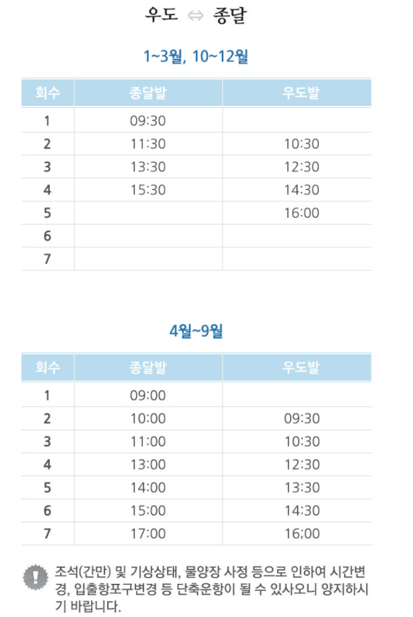 우린 종달항을 이용하진 않았지만 이 정보가 필요하신 분도 있을 것 같아 찾아서 첨부한다. 성산항에 비하면 배시간대가 다양하지 않다.