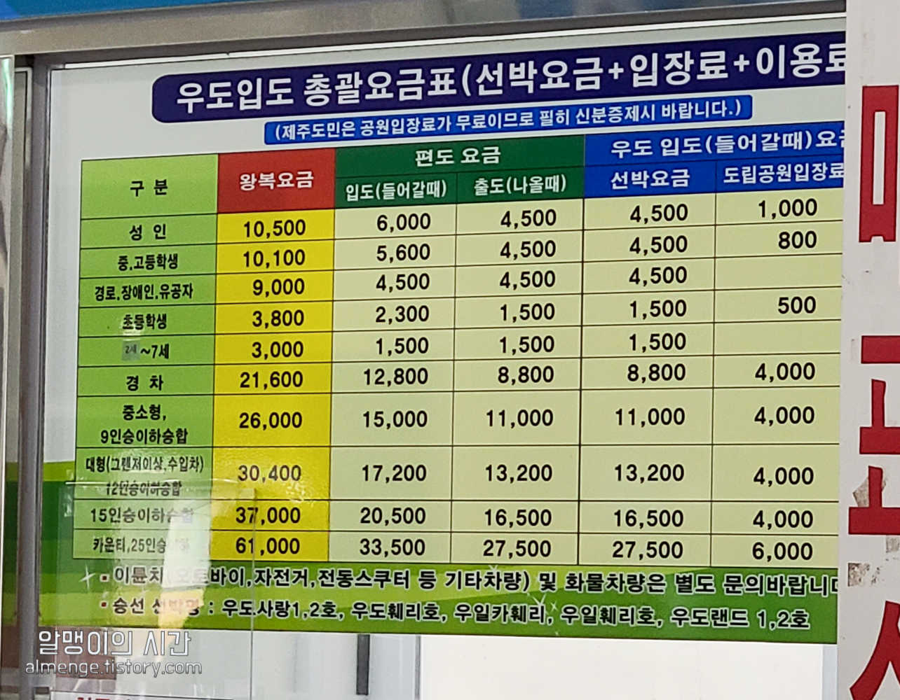 입도 요금과 출도 요금이 조금 다른데, 입도 요금에는 도립공원 입장료, 터미널 이용료가 포함되어 조금 더 비싸다.