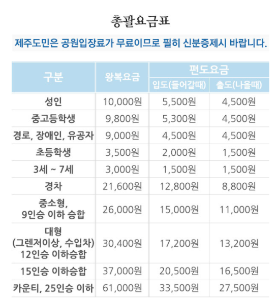 마찬가지로 도립공원 입장료, 터미널 이용료 등으로 인해 입도요금과 출도요금에 차이가 있으니 참고!