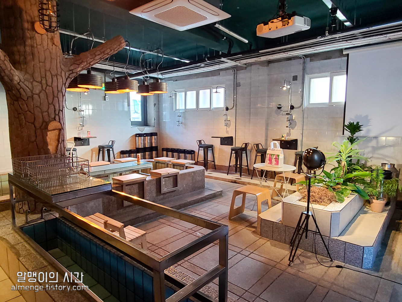 샤워기 뿐만 아니라 탕이 있던 곳까지 테이블과 의자로 활용한 점이 아이디어 굿! 조명도 은은하니 내부 취식 가능했으면 분위기 장난 아니었을 듯