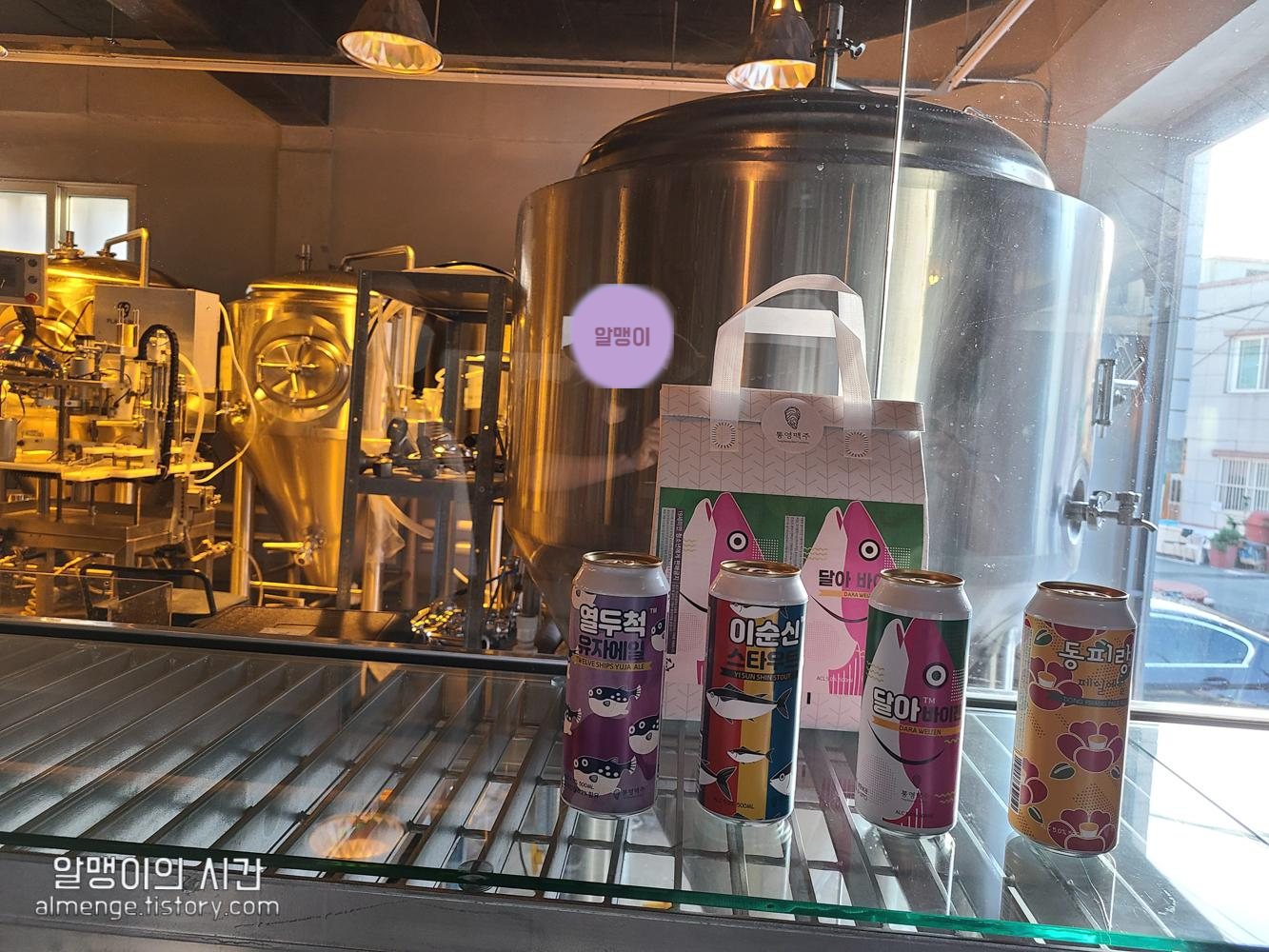 내부로 들어서면 양조장이 먼저 보이는데요. 이 곳에서 직접 수제 맥주를 만들고 있다고 해요. 맥주는 제가 갔을 땐 4종류 있었어요. 열두척 유자에일, 이순신 스타우트, 달아 바이젠, 동피랑 페일에일 등 이름부터가 통영 냄새 물씬! 6캔 세트로 구입하면 사진 속 보냉백에 예쁘게 포장해줘서 선물용으로도 좋을 듯!