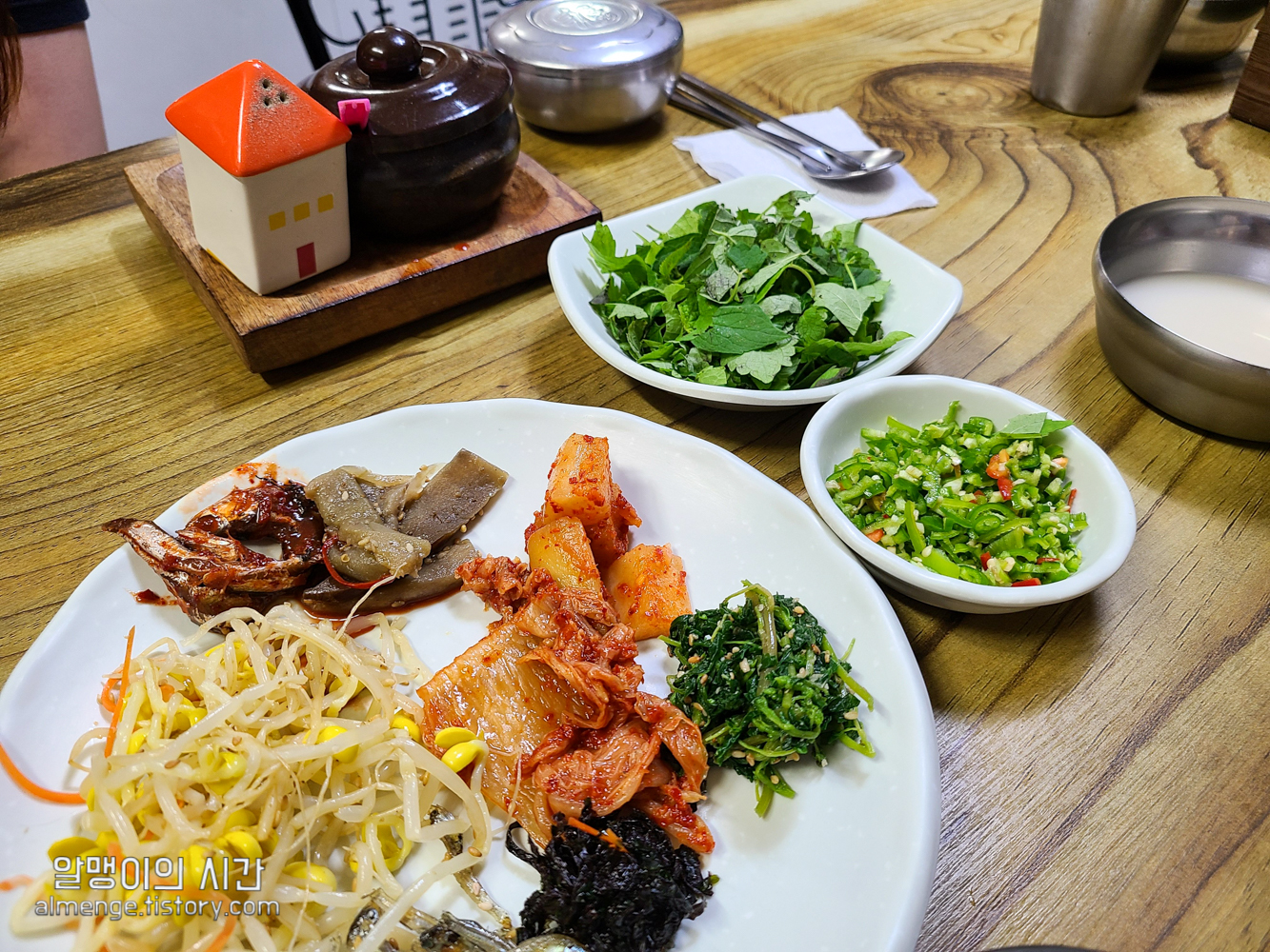 접시에 반찬을 조금씩 담아왔어요. 콩나물, 멸치 볶음, 파래, 나물, 석박지, 배추김치, 멸치 젓갈 등 9가지 정도의 반찬이 이 있어요. 경남이라 그런지 멸치 젓갈이 기본 반찬으로 나오는게 특이했어요.