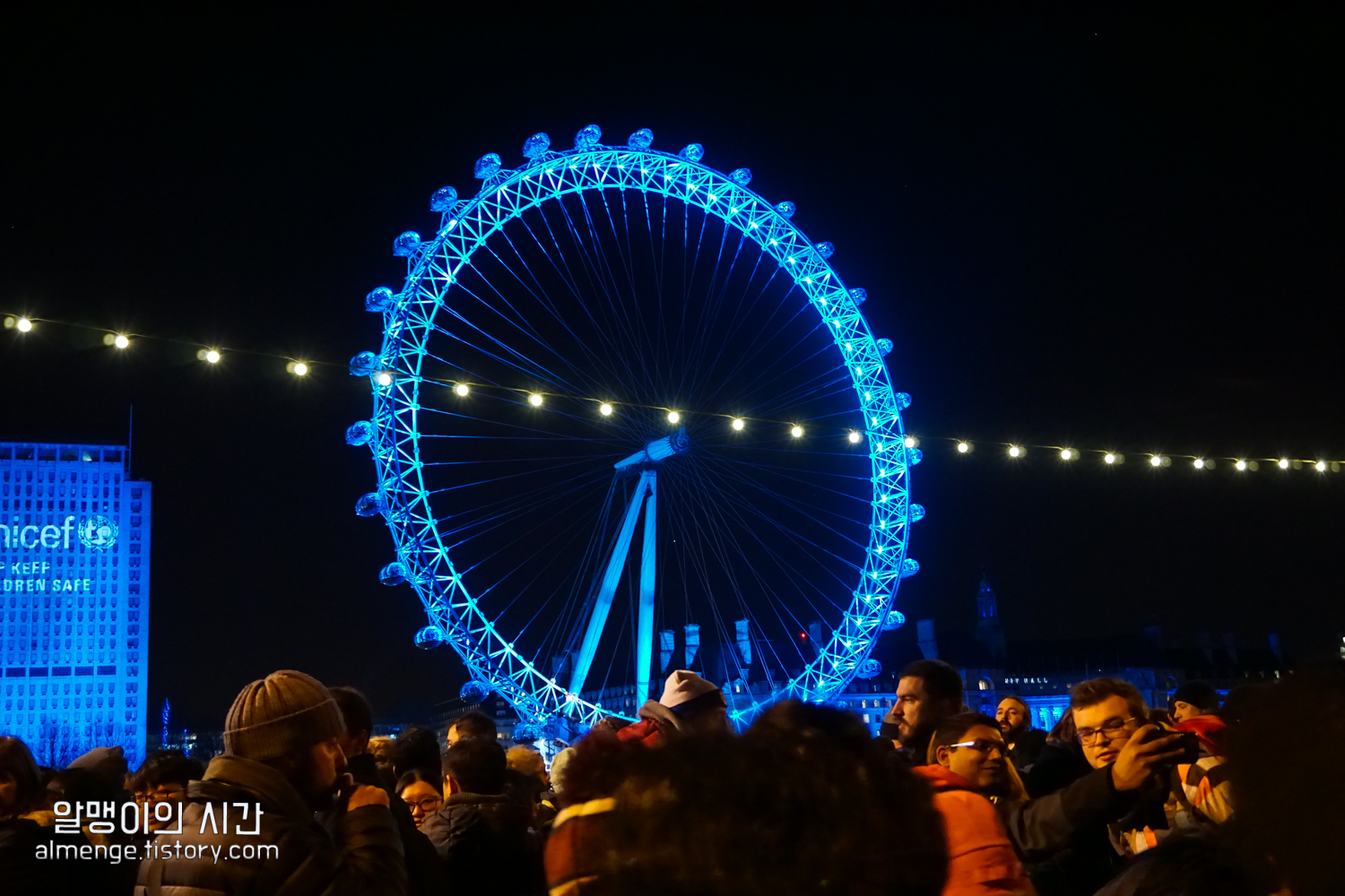 오후 8시. 유랑에서 구한 동행들을 가까스로 만나 불꽃놀이 장소에 입장했어요. 런던 새해 불꽃축제는 화이트존, 핑크존, 블루존, 레드존 등등 다양한 위치를 선택할 수 있었는데 제가 예약한 블루존은 런던아이를 정면으로 바라보는 위치.