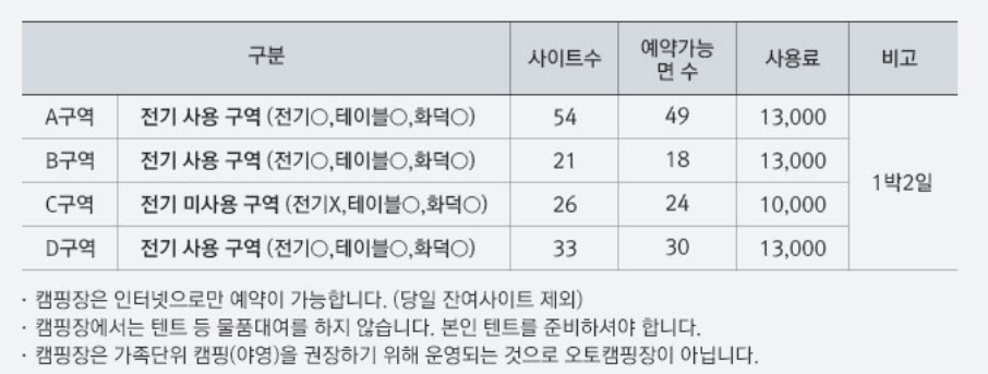캠핑장 체크인은 오후 2시 이후, 체크아웃은 다음 날 12시까지이므로 꽤나 넉넉한 편. A, B, C, D 사이트가 있는데 A, B, D 사이트는 전기 사용이 가능하고 C 사이트는 전기 사용이 불가함.