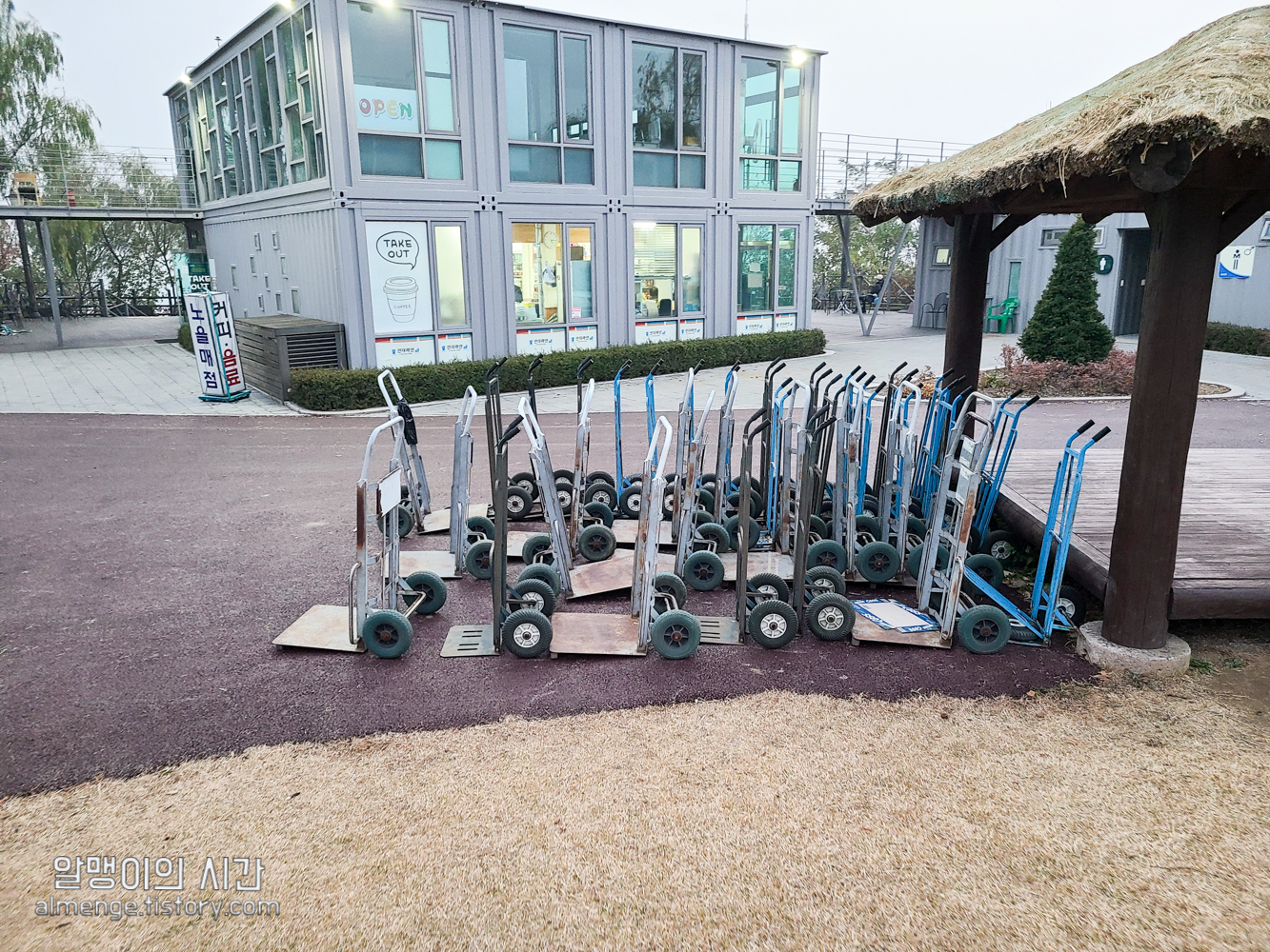 매점 건물 앞에는 짐수레가 있어