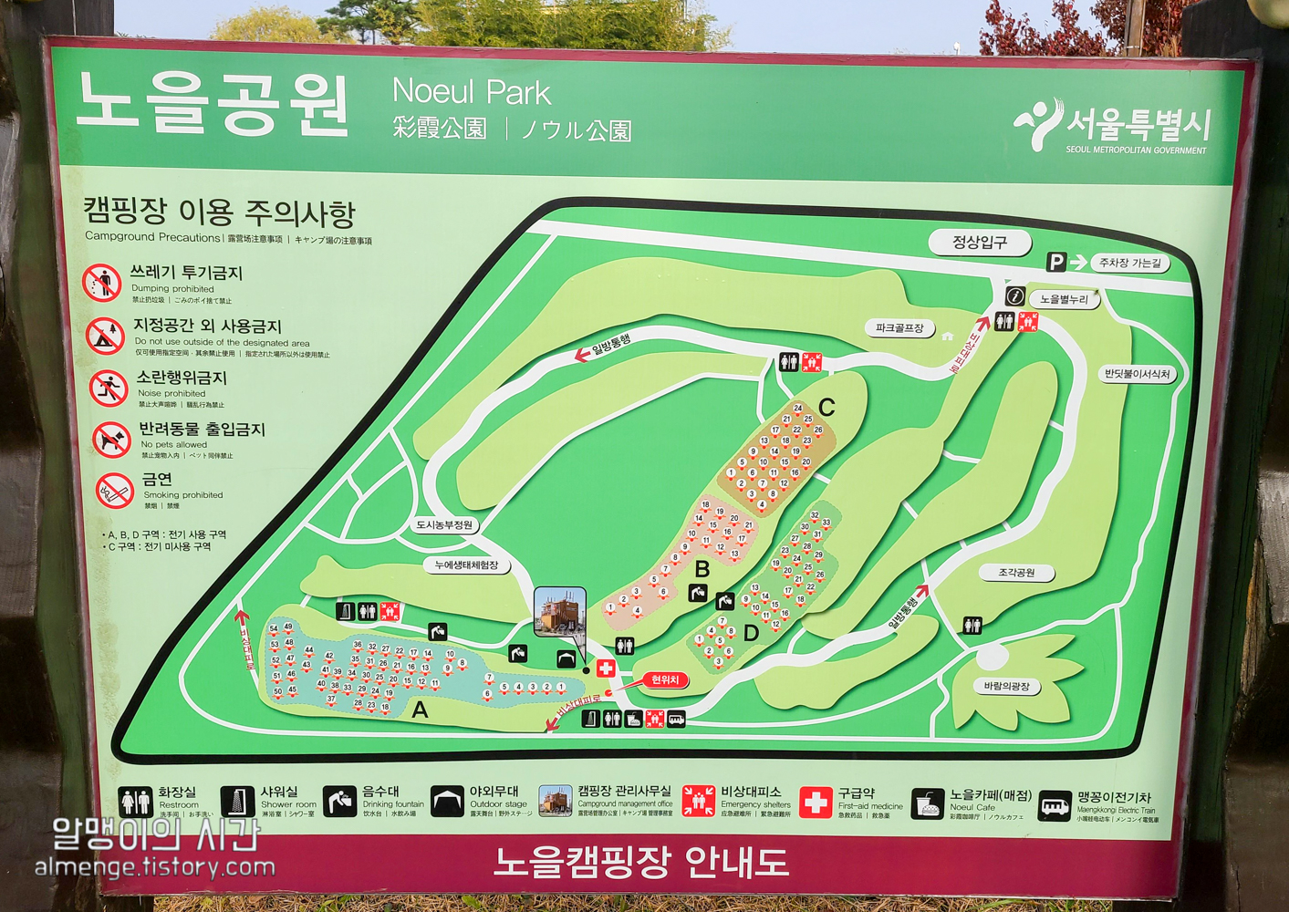 캠핑장 배치도는 위와 같다. 사이트마다 음수대(설거지 및 쓰레기 처리)가 간간히 있다. 관리사무소와 매점 건물 및 샤워실은 A와 D 사이에 있음. 편의시설과의 거리만 조금 차이가 있을 뿐 사이트의 컨디션은 다 비슷비슷하기 때문에 어딜 고르든 크게 상관은 없는 것 같다.