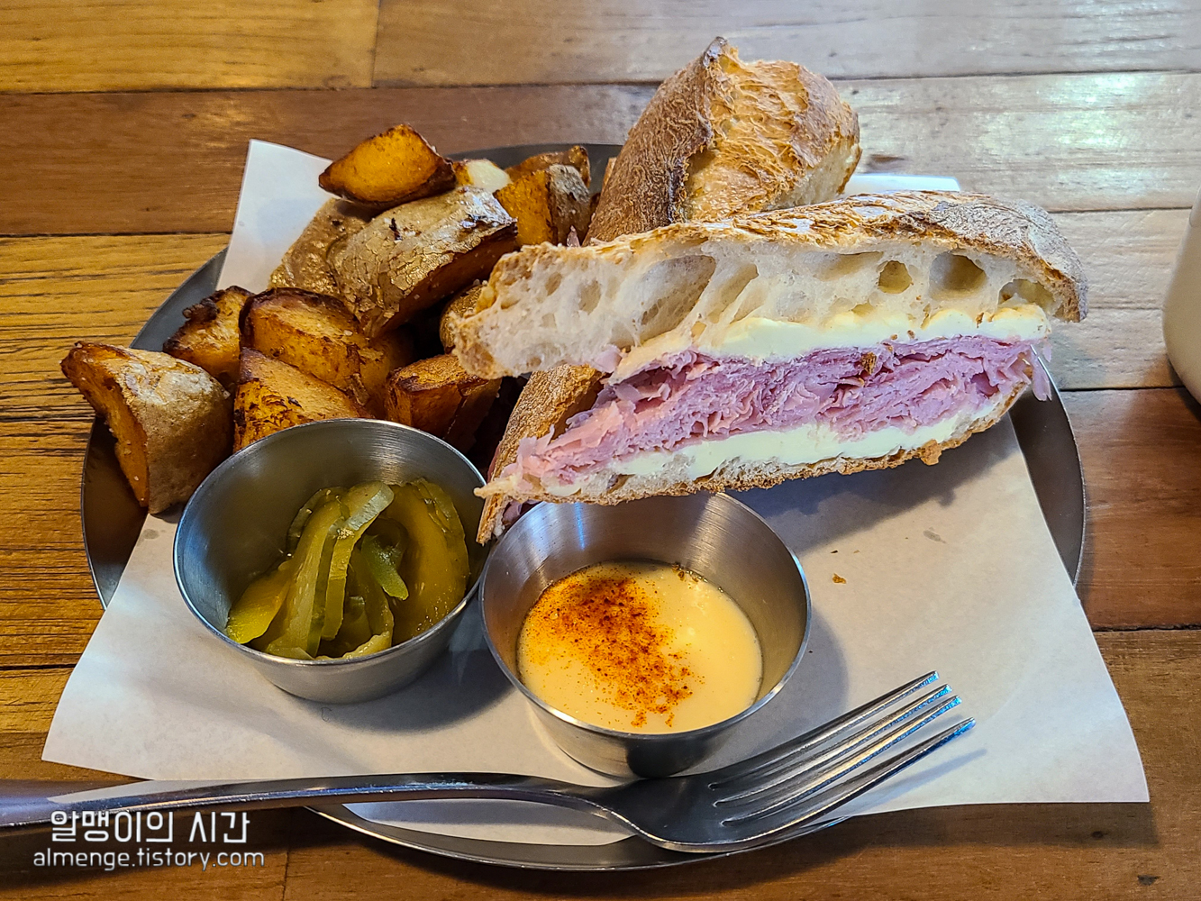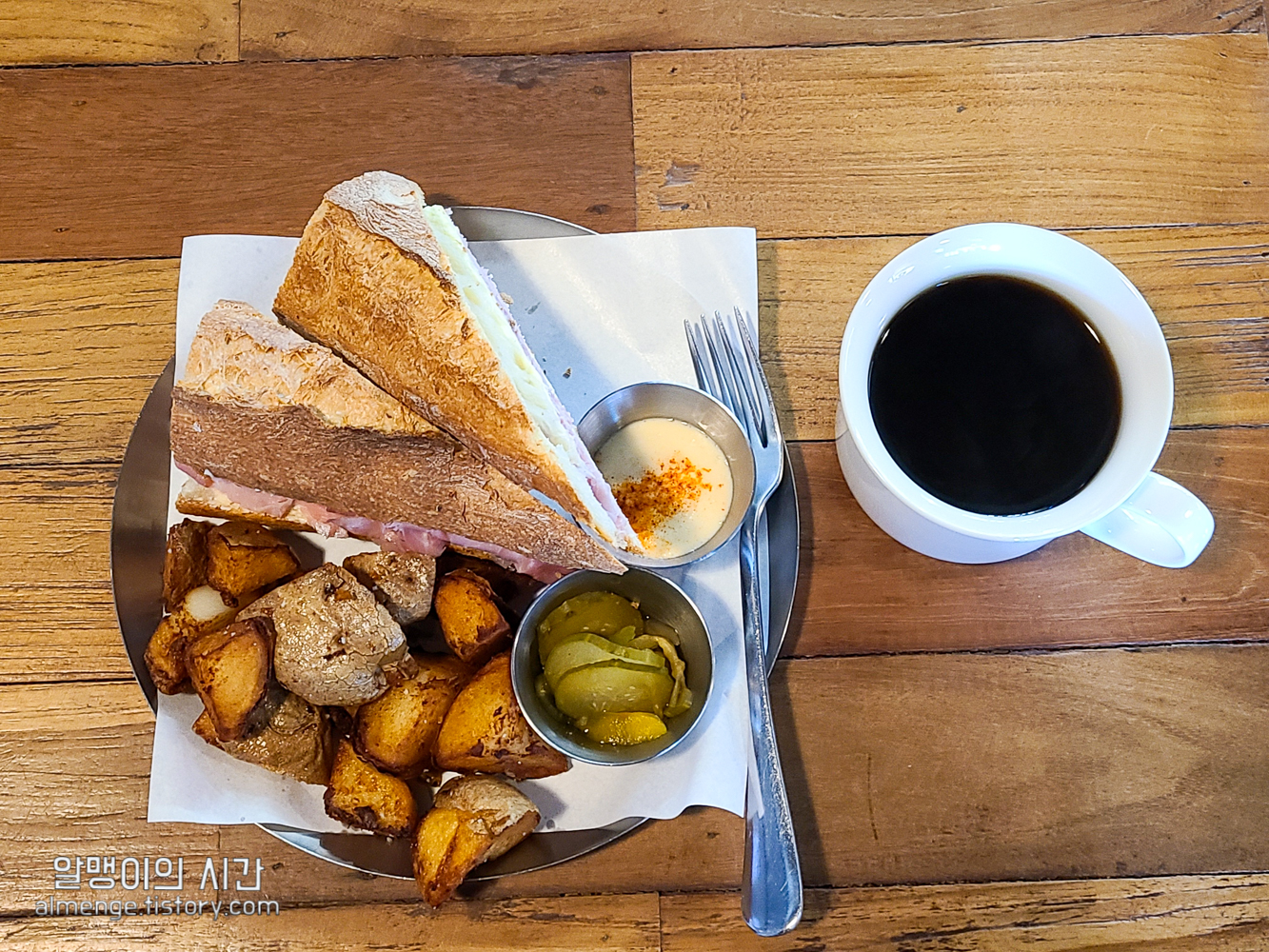커피 홀짝이며 기다리다보니 나온 잠봉뵈르. 샌드위치 치고 12000원이면 비싸다 생각했는데 같이 나오는 구성을 보니 어느정도 납득은 가네요. 사이드 감자튀김이 완전 푸짐푸짐