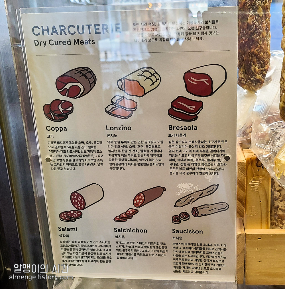 가공육이라고 하면 그냥 햄!! 이라고만 생각했었는데 가공육도 종류가 참 많더라구요. 코파, 론지노, 브레사올라, 살라미, 살치촌, 소시송 등 각기 다양한 방법과 부위를 사용한 샤퀴테리 가공육들