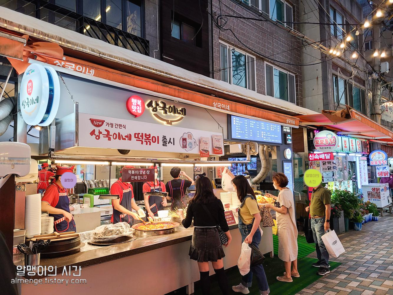 분식집 서치해본결과 검색해봤을 때 후기나 리뷰가 압도적으로 많았던 상국이네. 아니나 다를까 이 가게 앞에만 사람들이 계속 왔다갔다하더라구요. 포장 손님도 많고 먹고 가는 손님도 많았았어요. 안에도 가게 규모에 비해 상당히 많은 직원분들이 일하고 계셨음.