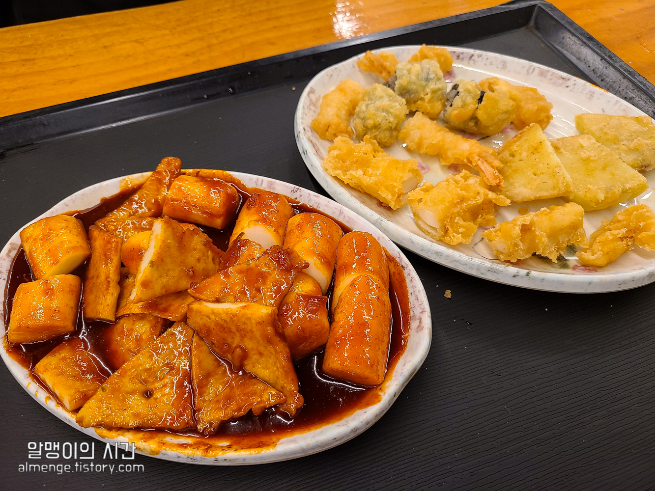 메뉴판이 가게 입구에 큼지막하게 붙어 있어 미리 보고 주문할 수 있어요. 우리에게 떡볶이는 막창 먹으러 가기전 에피타이저였으므로 둘이 가볍게 떡볶이 1인분 + 튀김 1인분 시켜서 노나먹기로(?) 했어요.