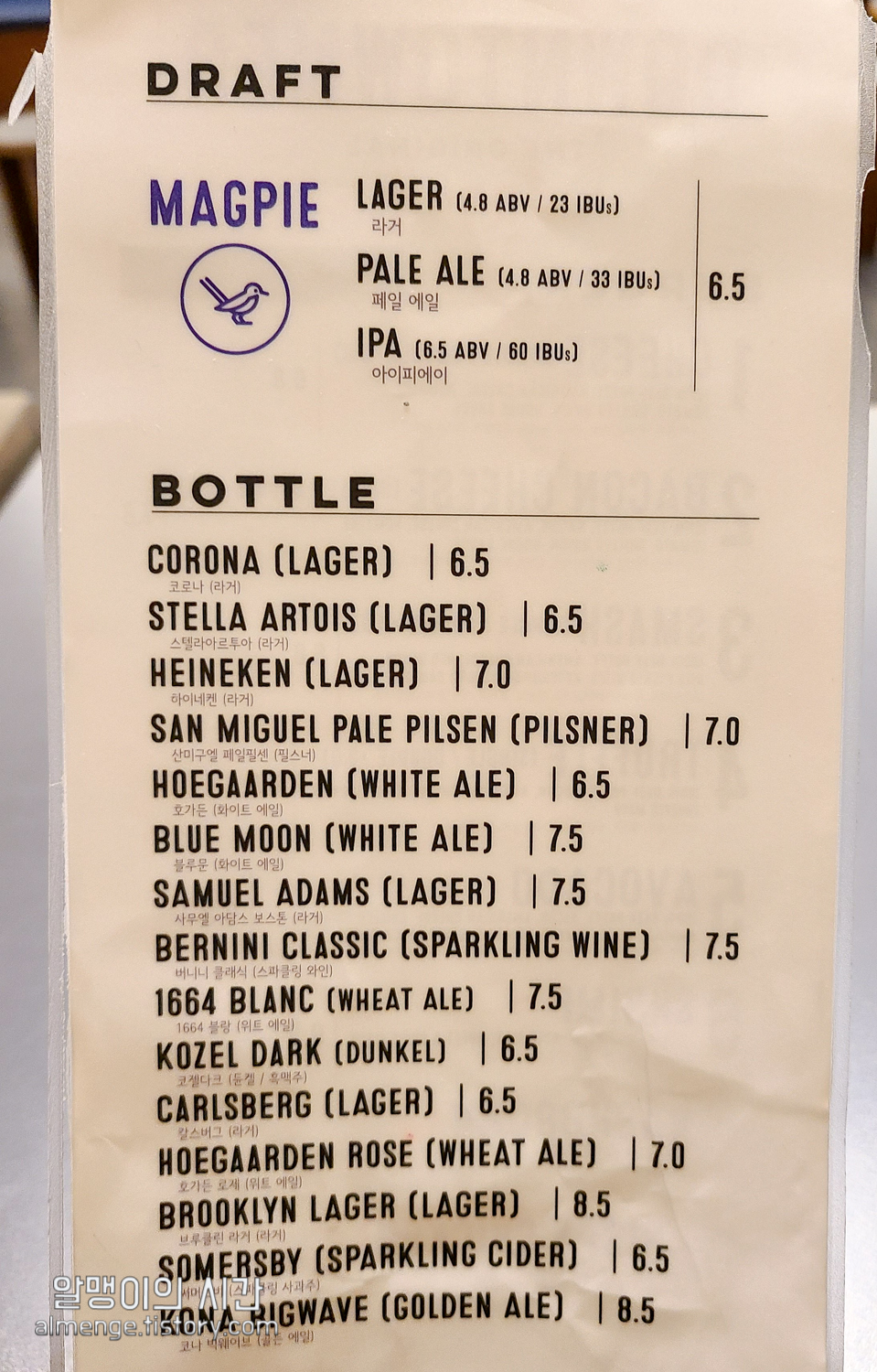 맥파이 라거 생맥주 한 잔 6500원. 시원하게 한 잔 하는덴 역시 라거죠잉. 기타 음료들은 위 메뉴 참고!