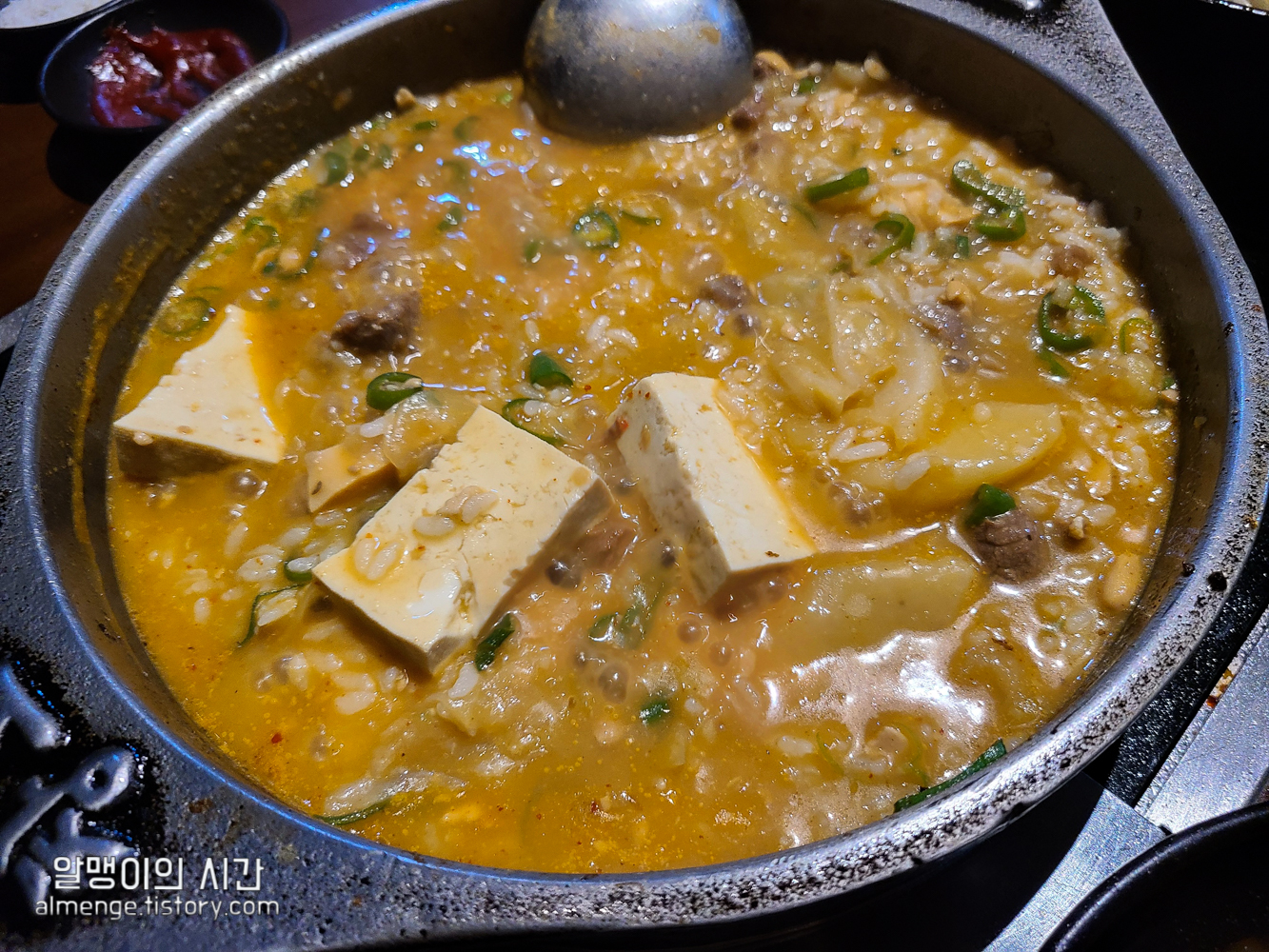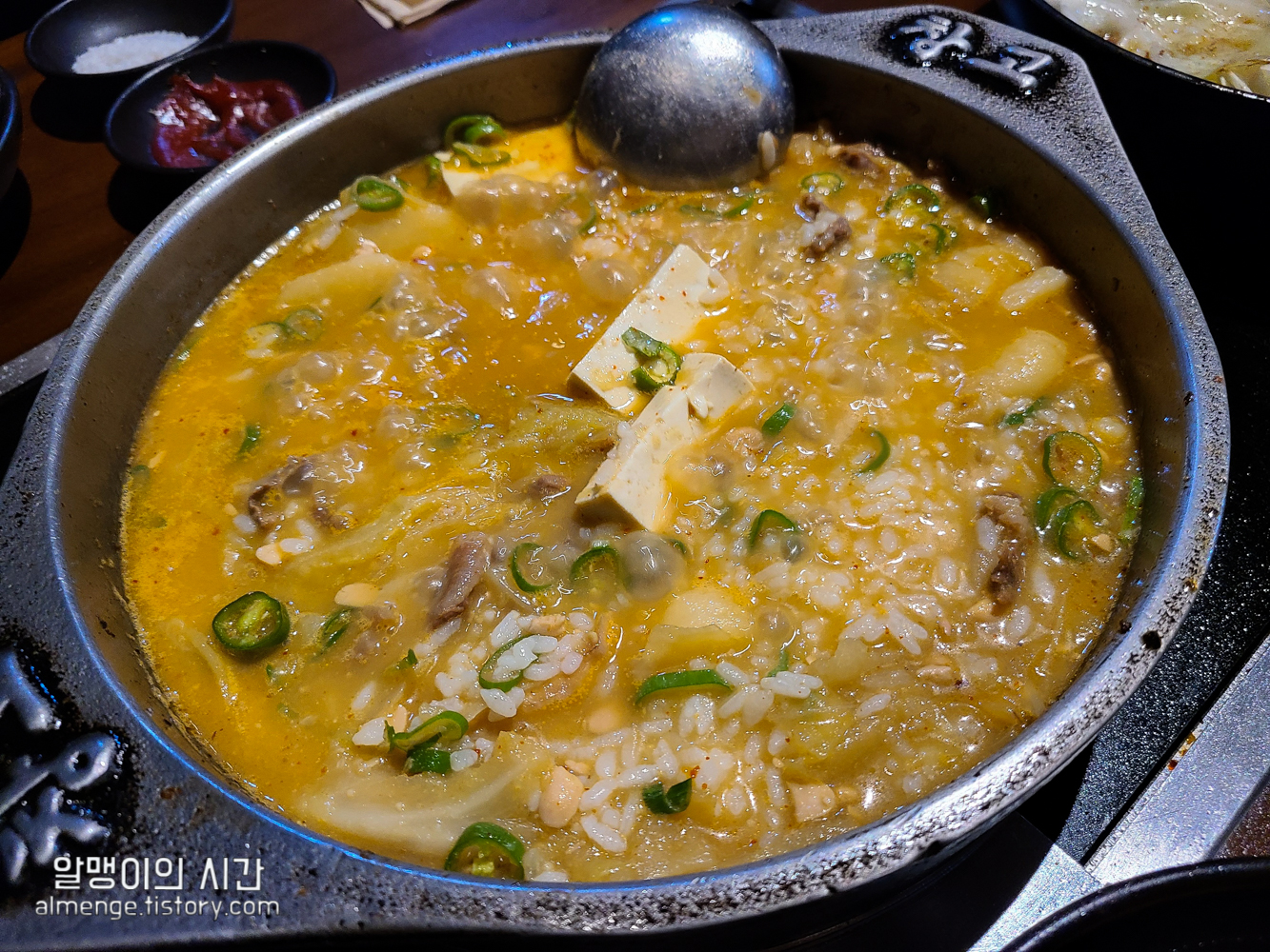 직원분이 파무침을 이용해 불판을 한 번 싹 닦아주신 후 철판에 된장찌개 투하! 파무침으로 불판 닦아 주시는 점이 특이했음. 그 다음엔 밥을 투하한 후 골고루 섞어주시는데, 된장말이를 끓이면서 밥이 조금 불 때까지 기다린 후 먹으면 된다.