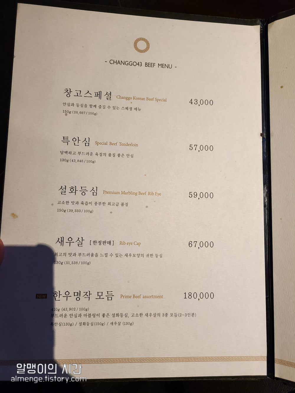 여의도 창고43 본점의 소고기 구이 메뉴는 총 다섯 가지.