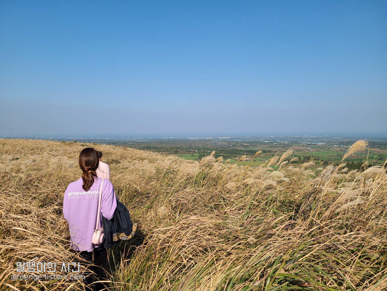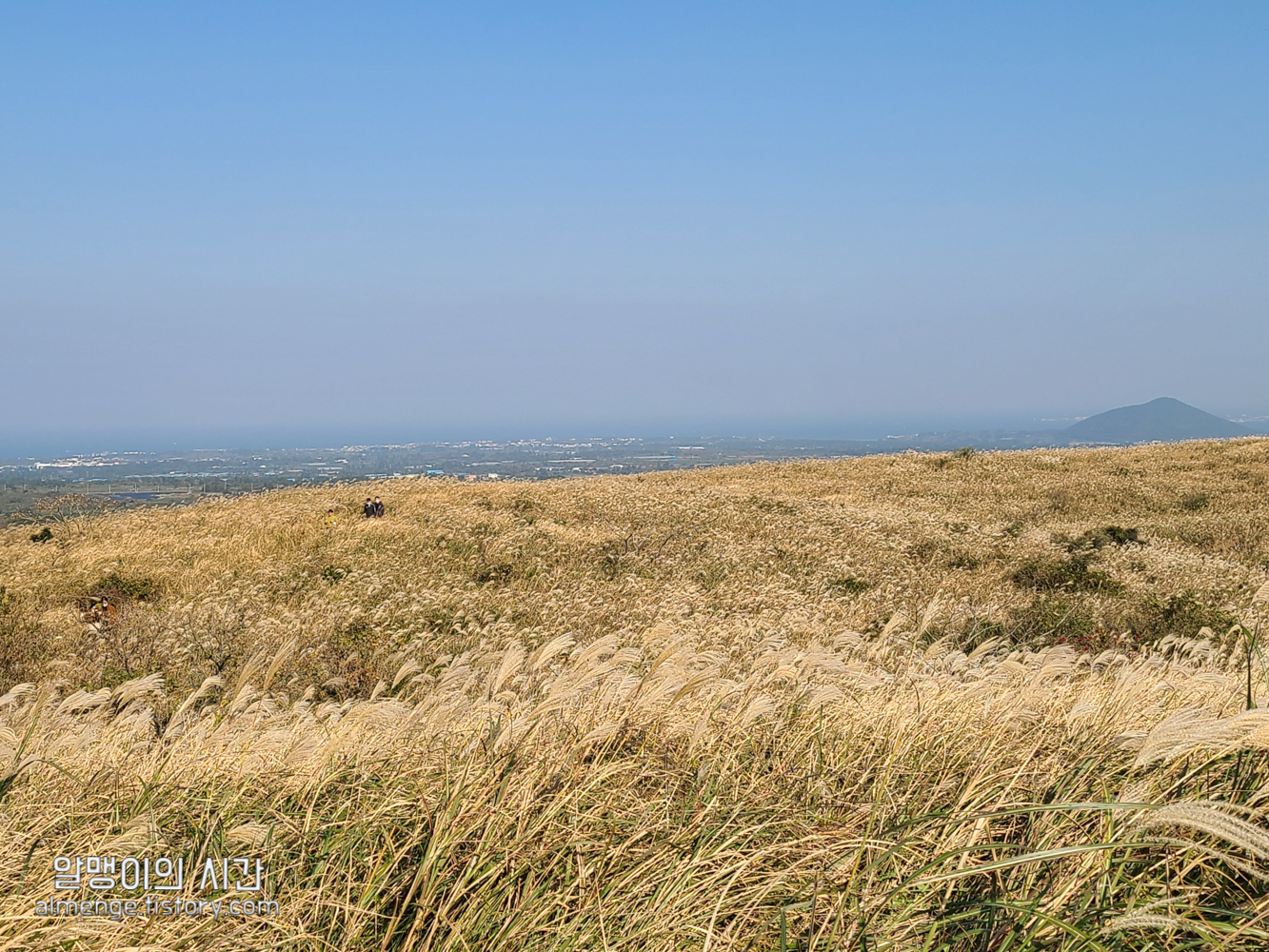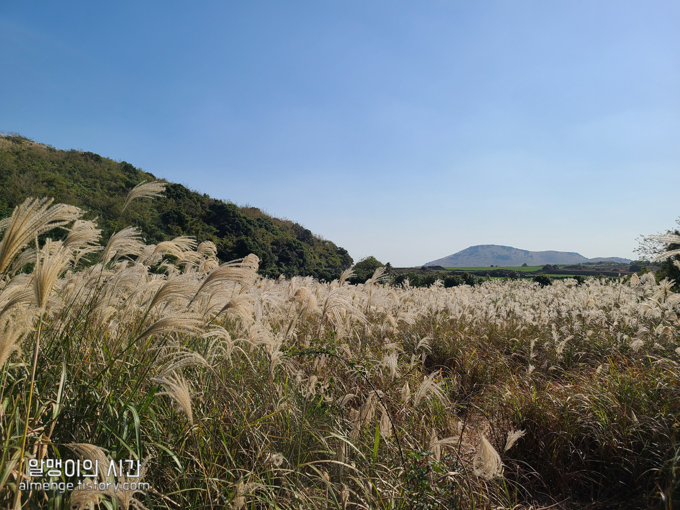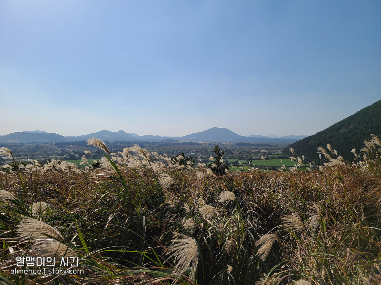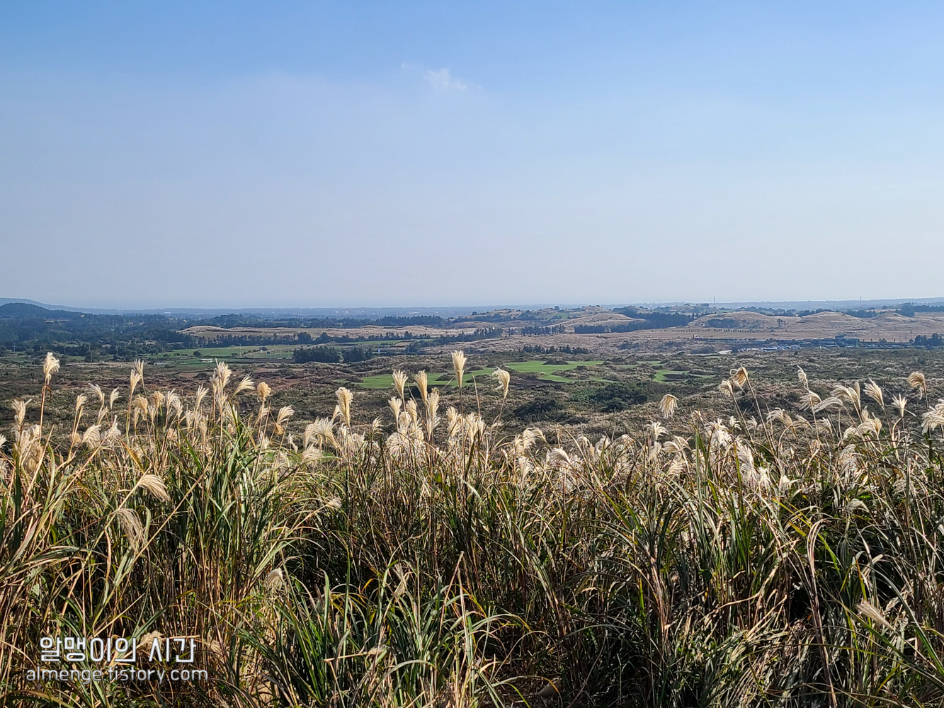 정해진 길은 딱히 없다. 안으로 들어가면 들어갈수록 사람들 발길로 만들어진 길도 뜸해지고 그냥 가고 싶은대로 돌아다니면 된다. 정처 없이 걷다 억새 너머로 보이는 제주도 풍경도 봐주고 하면 이런게 바로 힐링!
