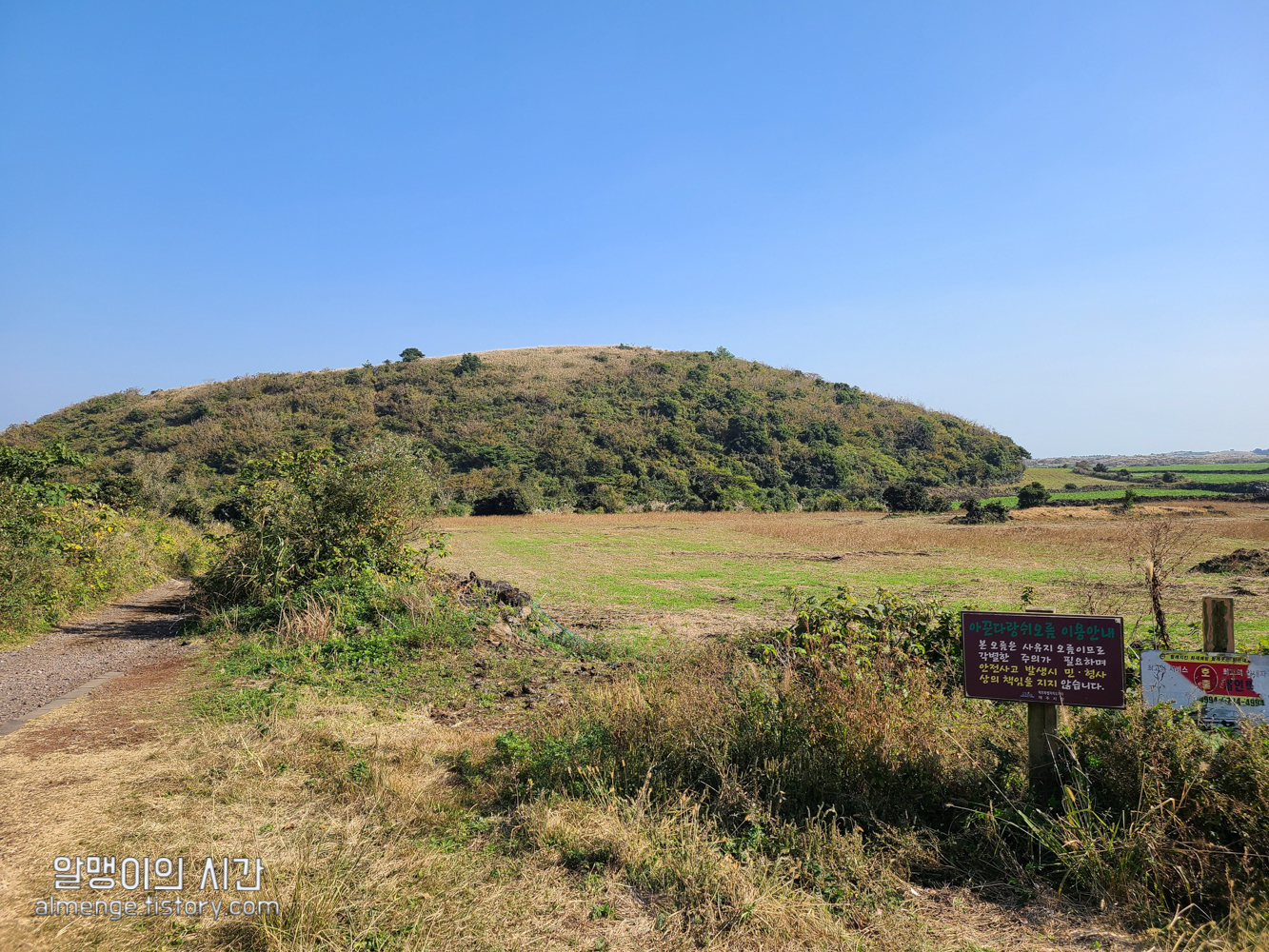 주차하고 아끈 다랑쉬 오름으로 가는 길. 이 곳은 사유지라고함. 눈 앞에 보이는 낮은 둔덕 같은게 아끈 다랑쉬 오름이다. 겉보기에도 부담없이 갈 수 있을 각.