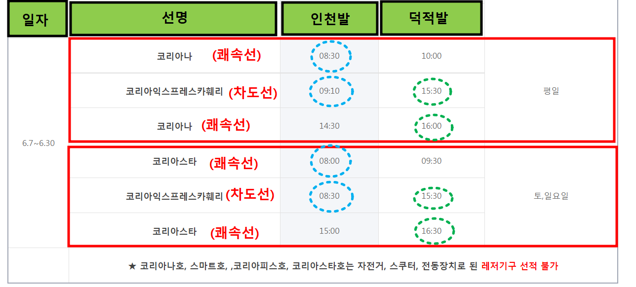 <인천-덕적도(하늘색), 덕적도-인천(초록색)>