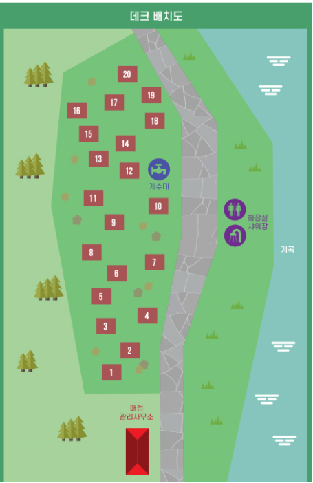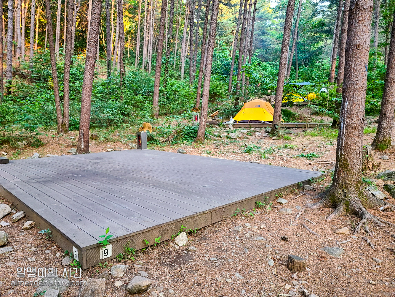 오늘의 집 9번 데크. 지난 번엔 윗쪽인 14번, 16번 데크에서 지내봤는데, 굳이 호잣캠의 명당이라고 하면 가장 안쪽인 20번과 16번 정도를 꼽겠지만 두 번 가본 결과 개수대 바로 옆인 12번과 10번만 빼면 다 비슷비슷한 것 같다.